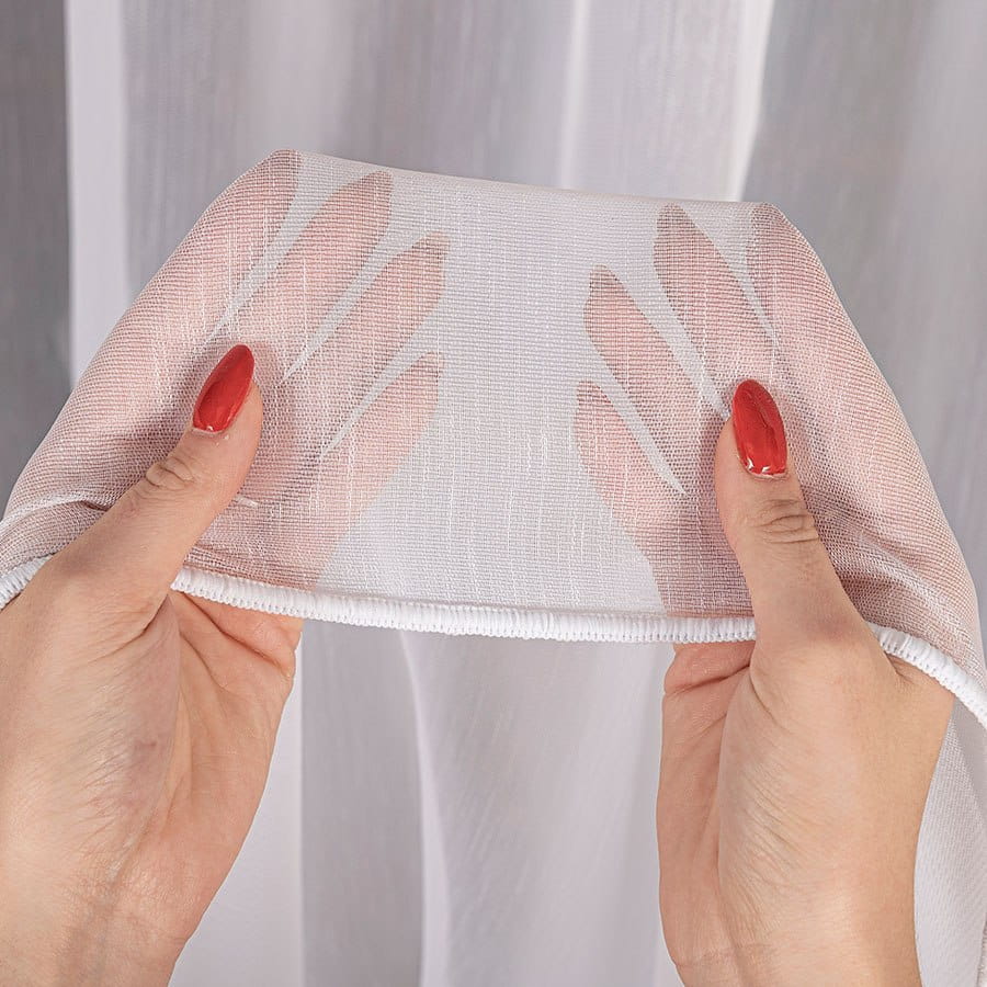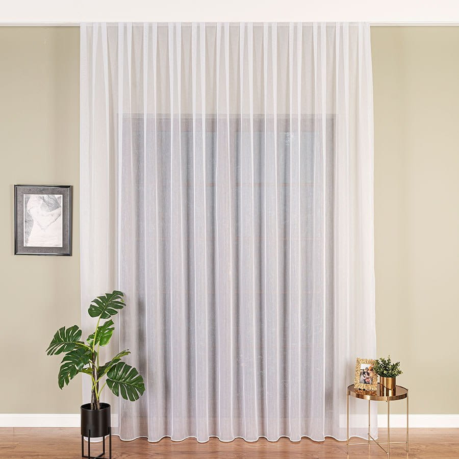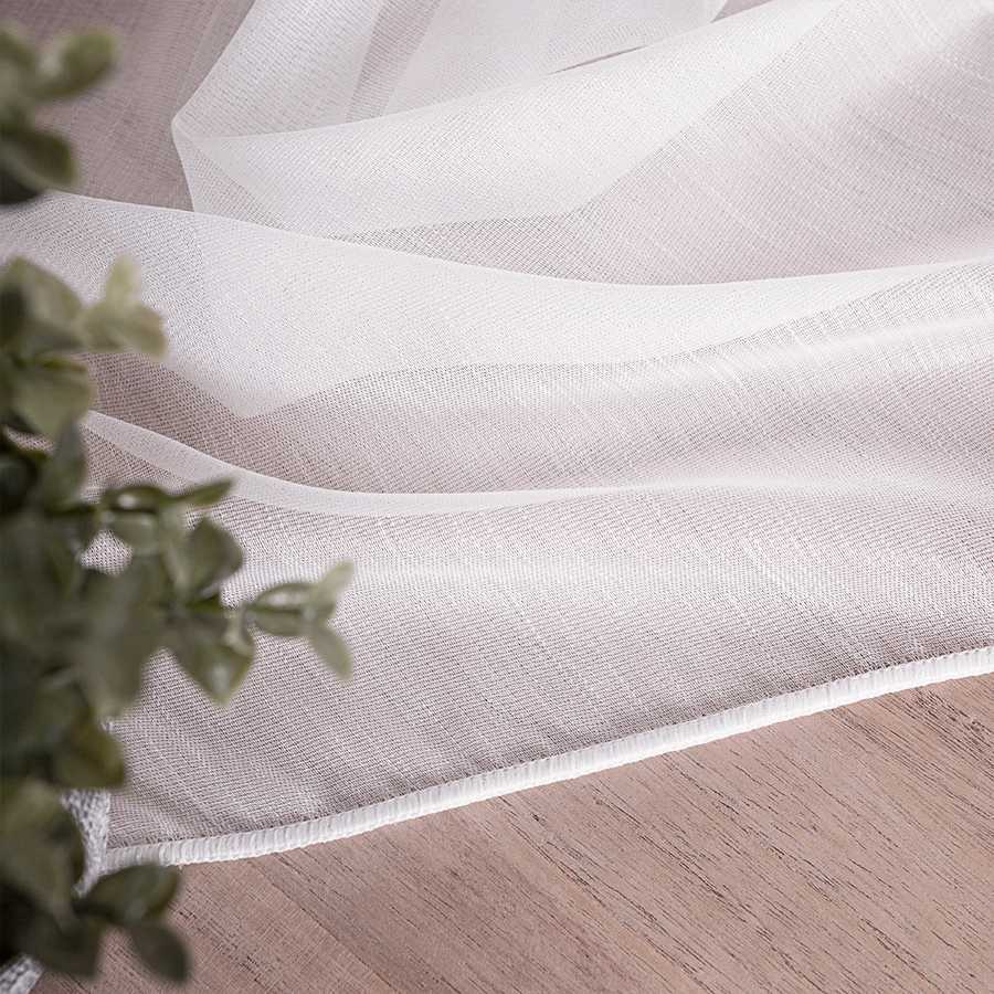 Wysokiej jakości firana biała w I gatunku wyprodukowana w Turcji. Tkanina jest delikatna, jedwabista o gęstej bambusowej strukturze. Charakteryzuje się miękkością co nie sprawia problemów przy dekorowaniu wnętrza. Materiał przy lekkim odwirowaniu nie gniecie się i nie wymaga prasowania. Dół firany wykończony został ołowianką dodatkowo obciążającą firanę, aby układała się w równomierne fale.
