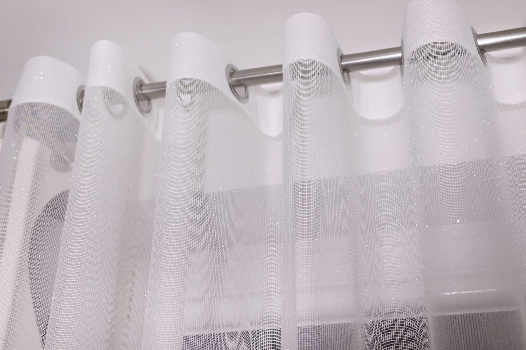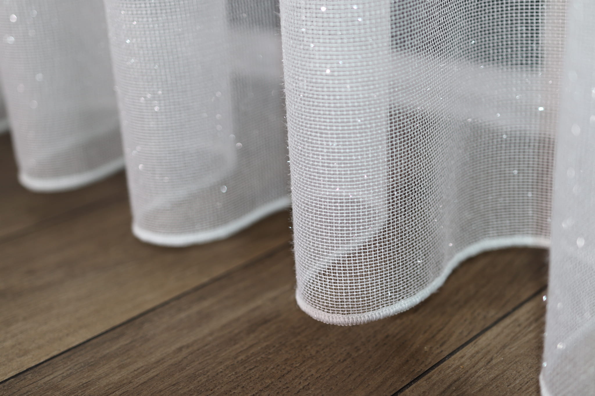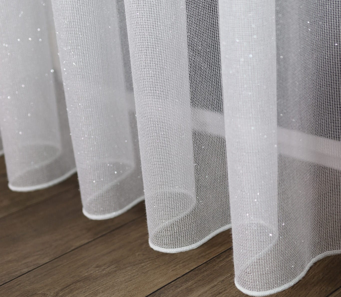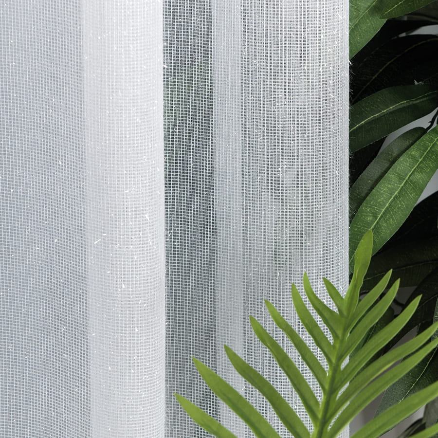 Firana CLIO sprawi, że Twoje okno zyska stylową i oryginalną dekoracje. Delikatna struktura siateczki w ładnym odcieniu bieli została wzbogacona o subtelnie odstające, połyskujące nitki, które w promieniach słońca pięknie się błyszczą dodając wnętrzu niepowtarzalnego uroku.