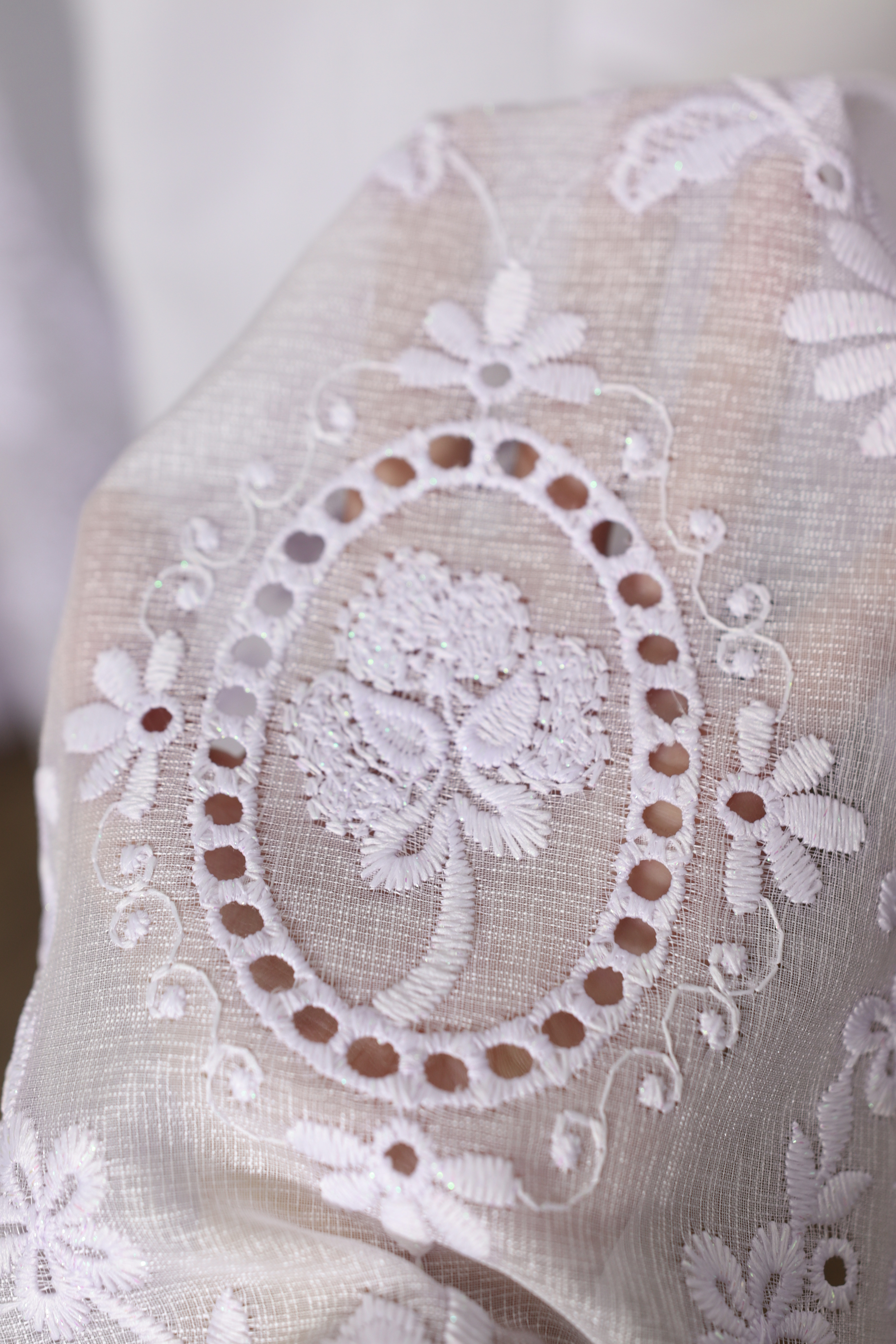 Firanę zdobi drobny haft, równomiernie rozmieszczony na całej powierzchni. Dolna część została wykończona bardziej dekoracyjnym motywem z błyszczącą nicią. Deseń łączy elementy roślinne i kwiatowe, tworząc lekką i elegancką kompozycję.