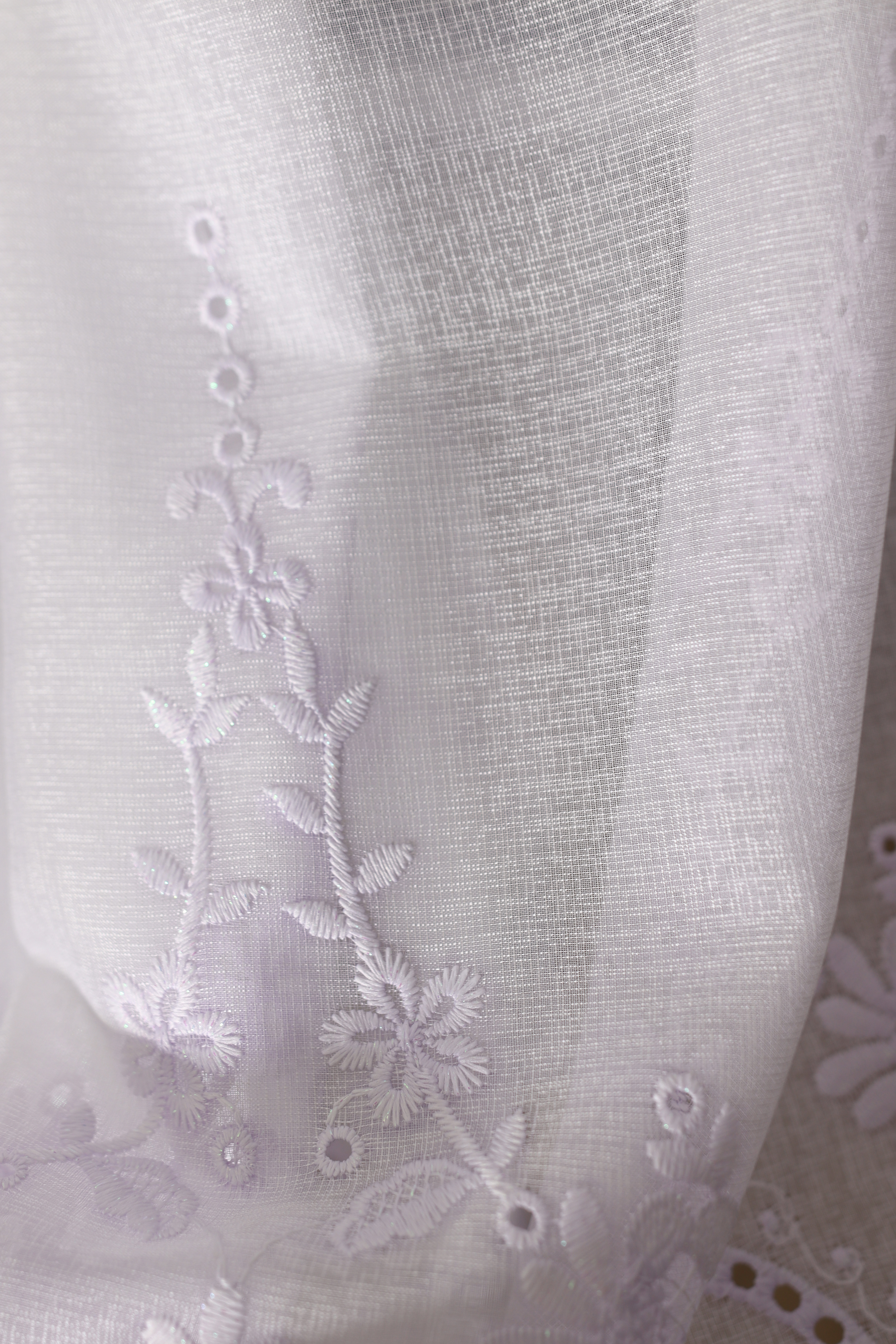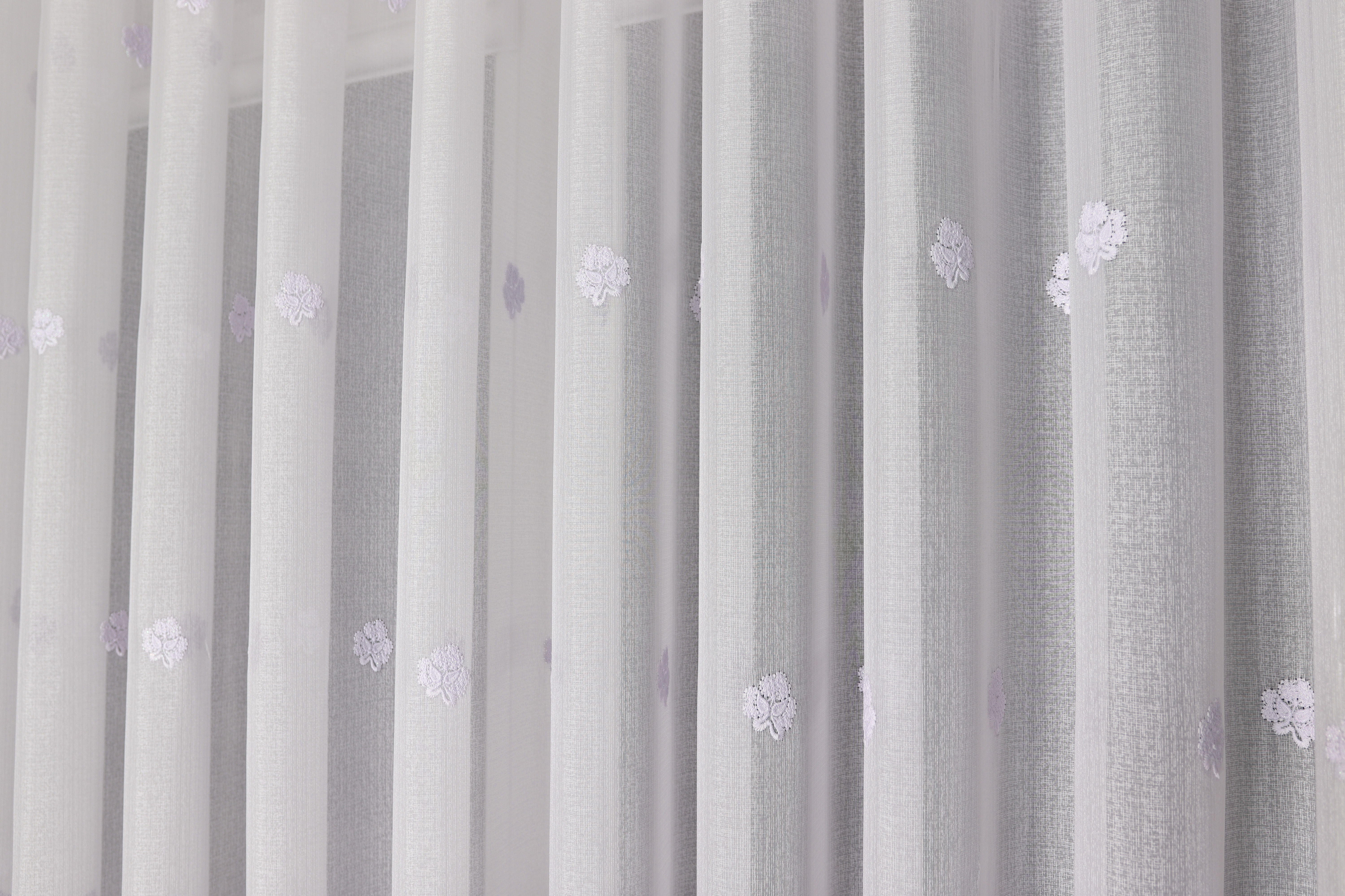 Wysokiej jakości firana z haftem w kolorze białym w chłodnym, fioletowym odcieniu. Tkanina subtelnie rozprasza światło słoneczne, dzięki czemu nie zaciemnia pomieszczenia, a jednocześnie zapewnia poczucie prywatności. Materiał cechuje się trwałością oraz łatwością w pielęgnacji.