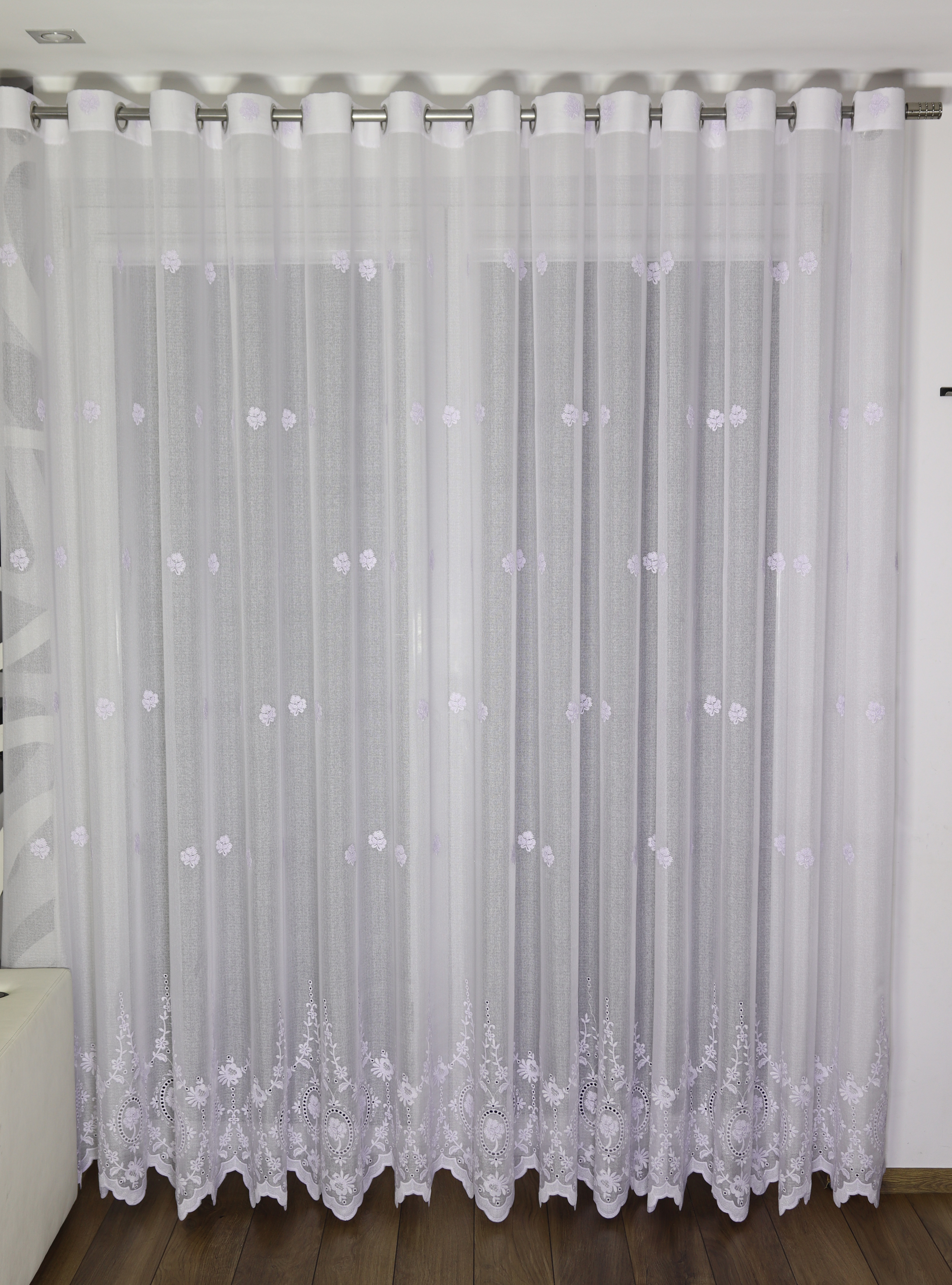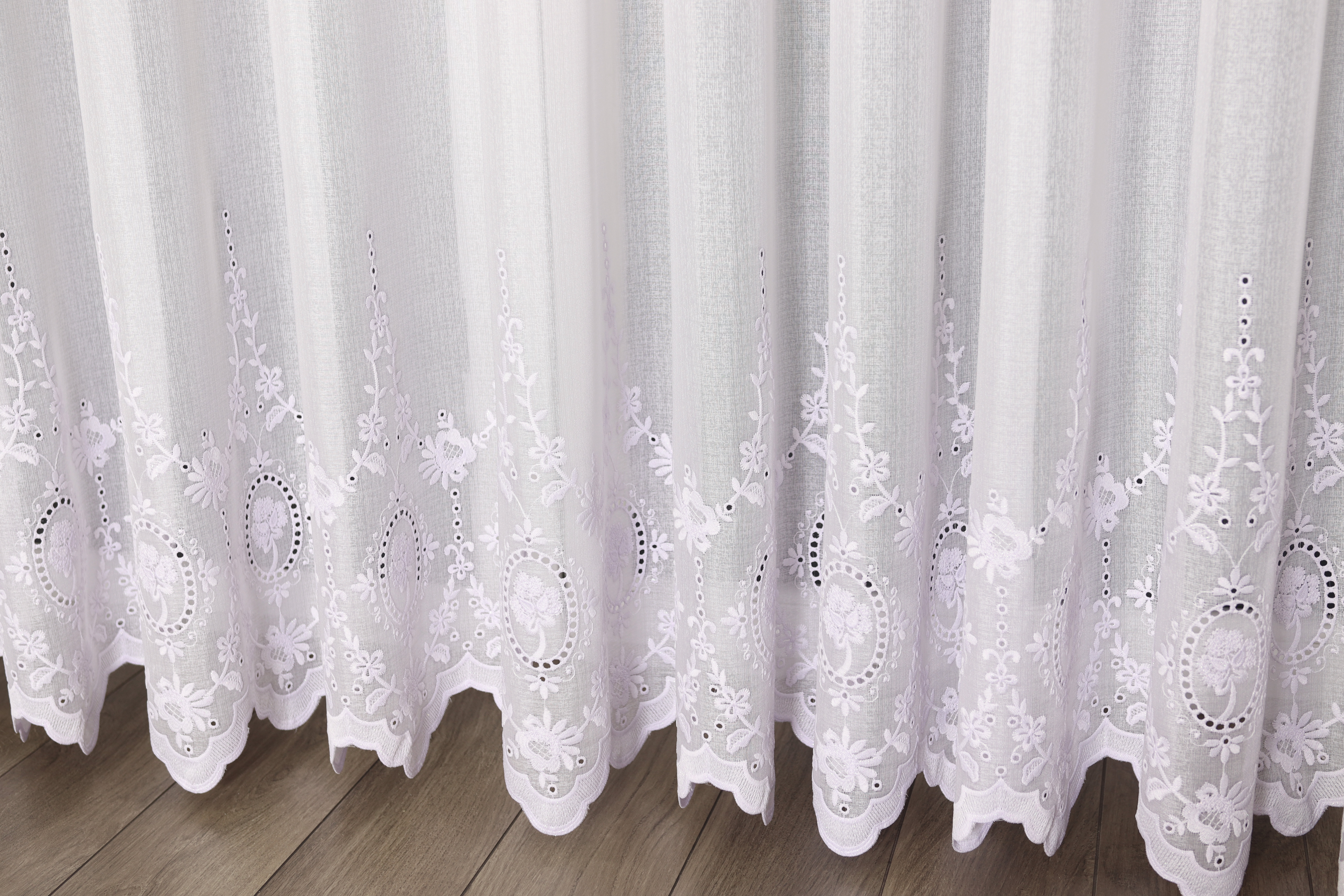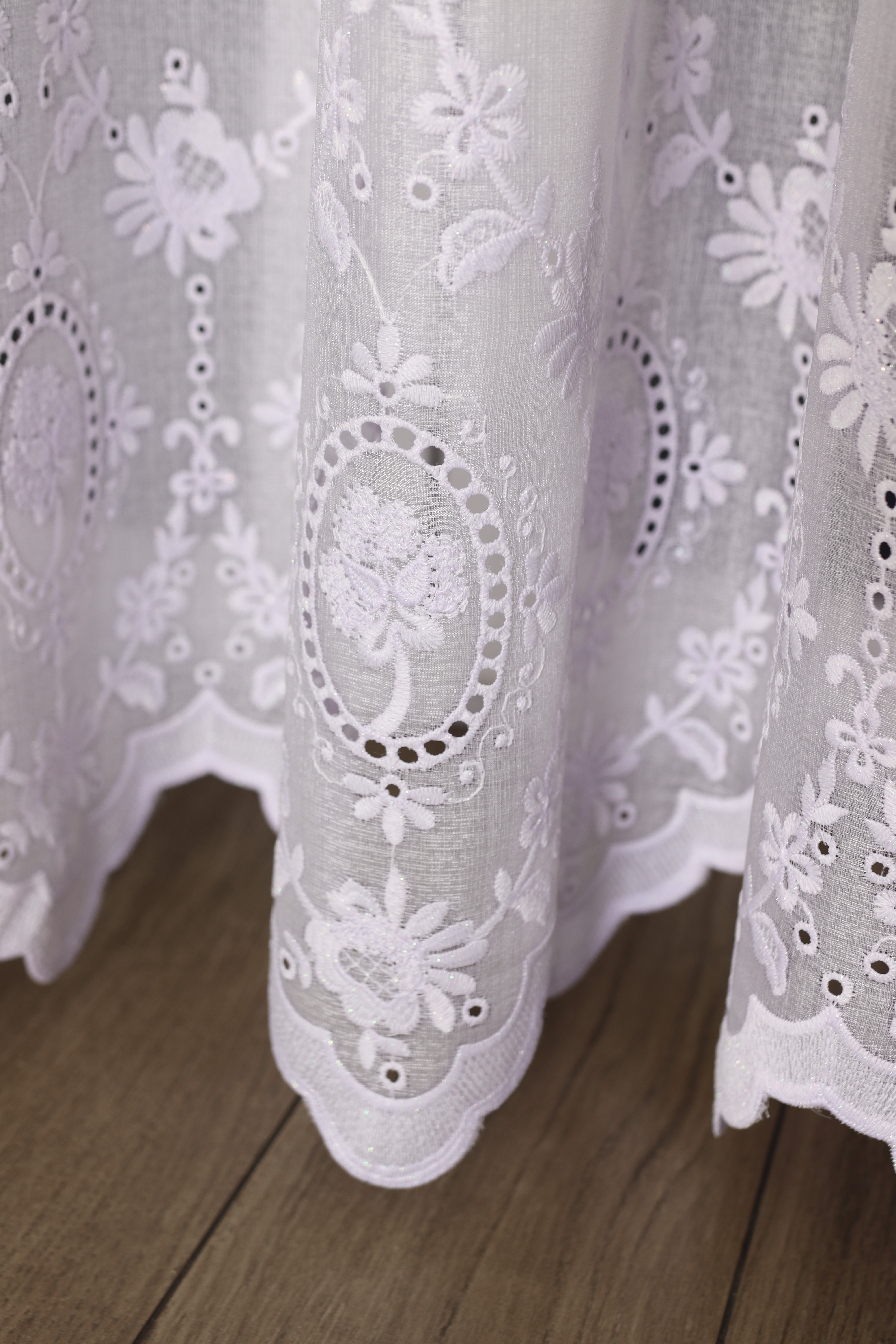 Firanę zdobi drobny haft, równomiernie rozmieszczony na całej powierzchni. Dolna część została wykończona bardziej dekoracyjnym motywem z błyszczącą nicią. Deseń łączy elementy roślinne i kwiatowe, tworząc lekką i elegancką kompozycję.