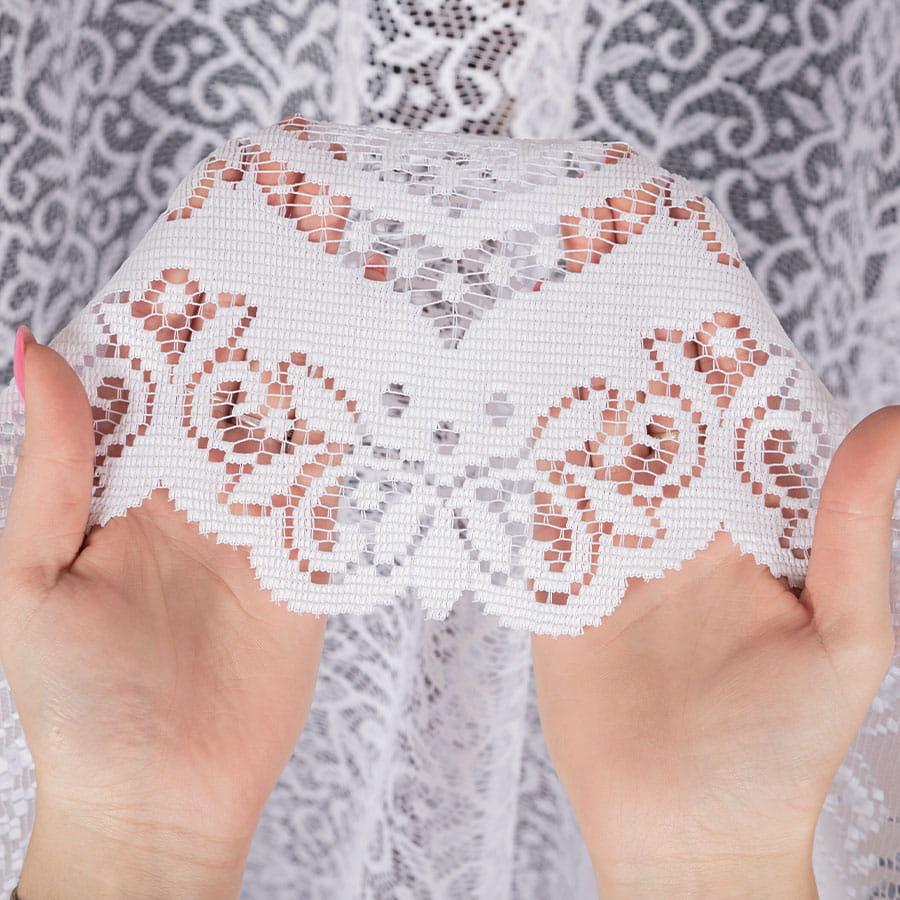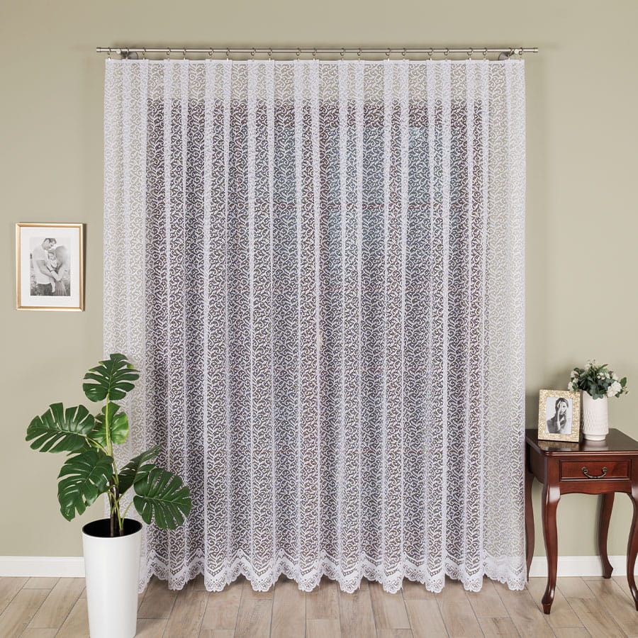 Firana żakardowa z dekoracyjnym wzorem roślinnym na całej powierzchni oraz falistym wykończeniem to połączenie stylu i funkcjonalności. Wykonana z delikatnej, a jednocześnie trwałej tkaniny, bardzo dobrze przepuszcza naturalne światło, tworząc w pomieszczeniu przytulną atmosferę. Nie wymaga prasowania – po praniu wystarczy wilgotną firanę zawiesić na karniszu, a sama ułoży się w elegancki sposób.