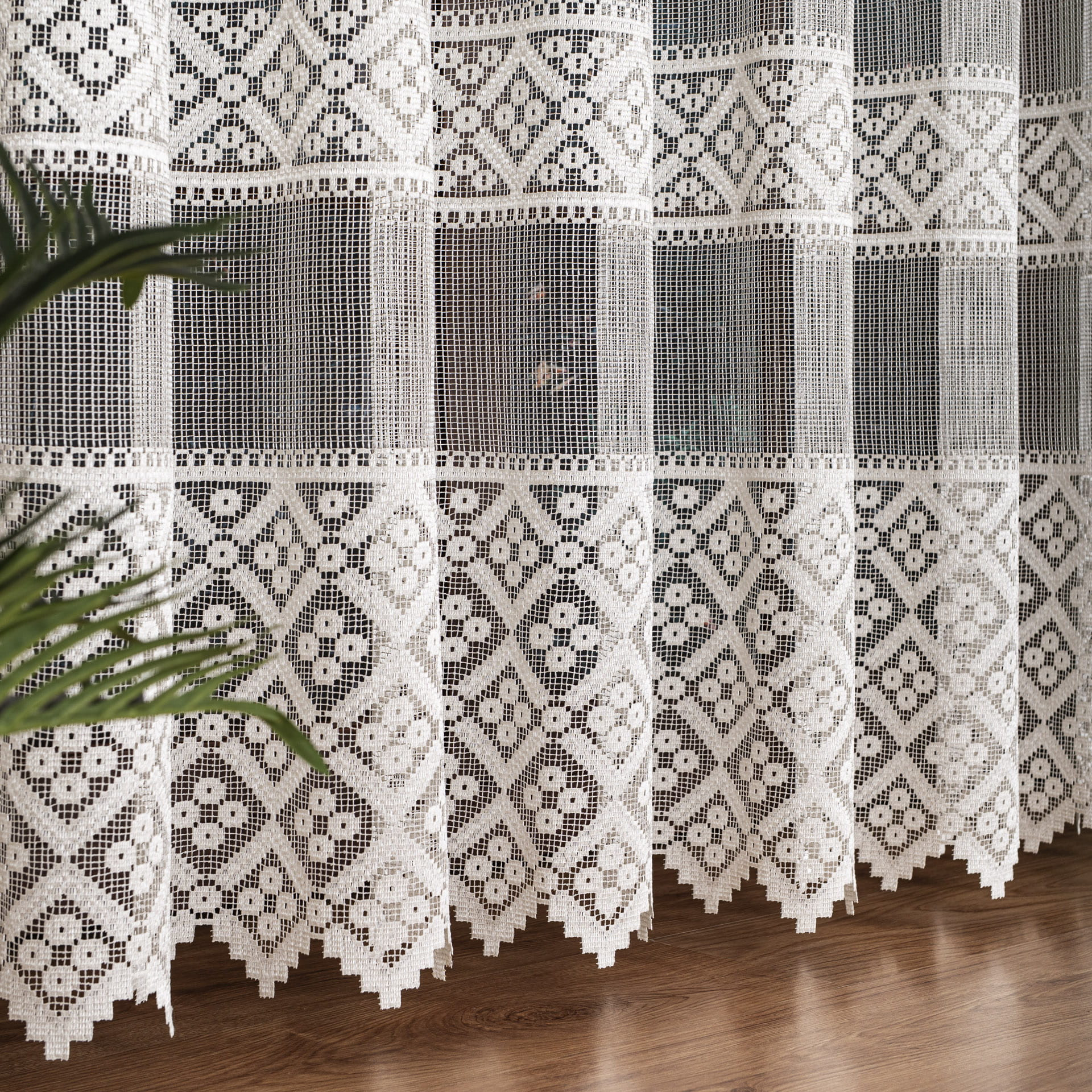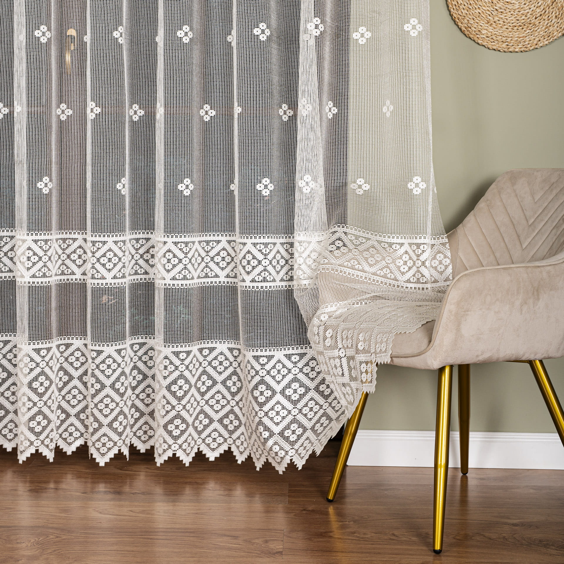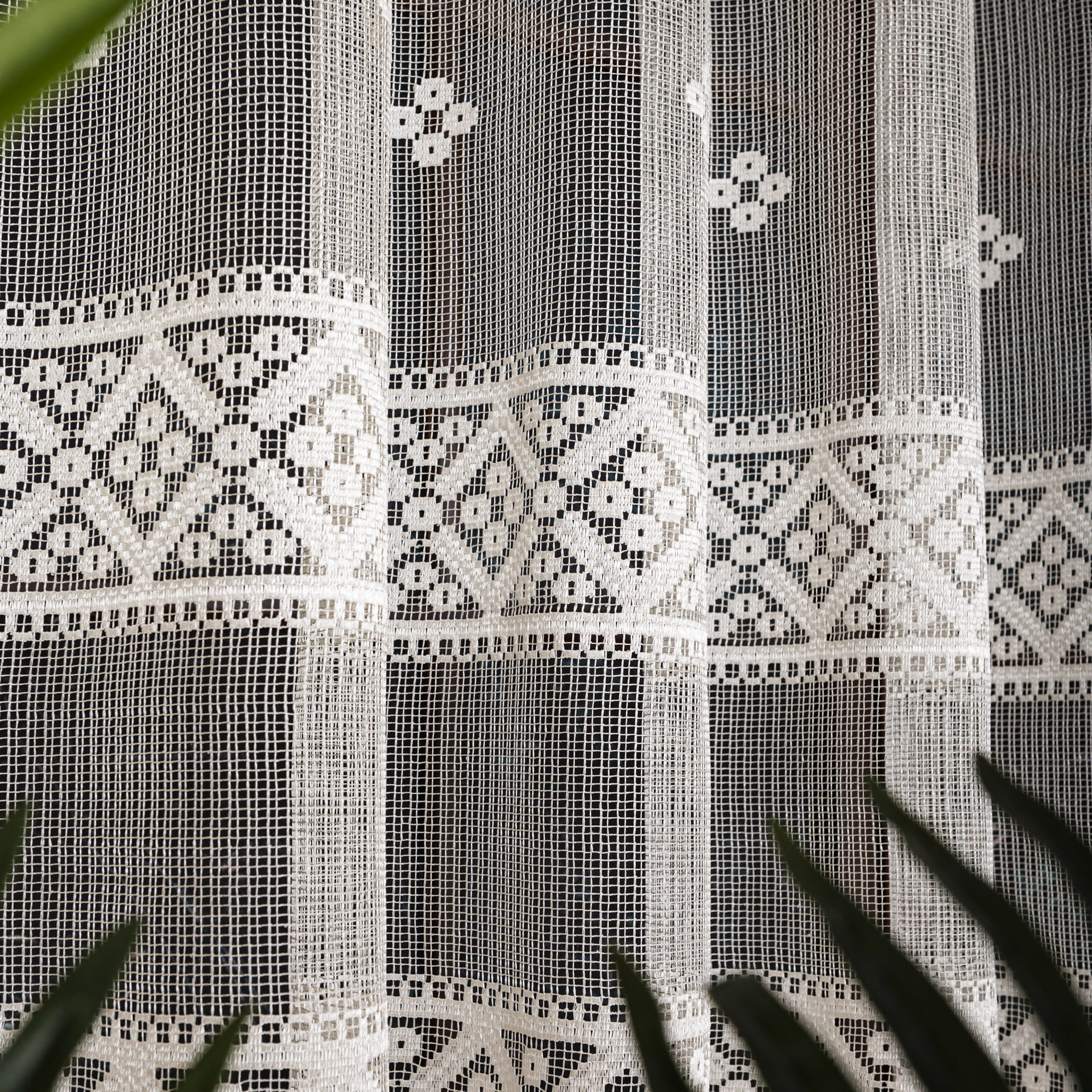Efektownym elementem firany jest szeroki pas u dołu, ozdobiony wyrazistym wzorem geometrycznym. Stylowe romby tworzą symetryczną kompozycję, która przyciąga wzrok i nadaje firanie niepowtarzalnego charakteru. Firana jest łatwa w pielęgnacji i nie wymaga prasowania – po praniu wystarczy wilgotną zawiesić na karniszu, a sama ułoży się w elegancki sposób.