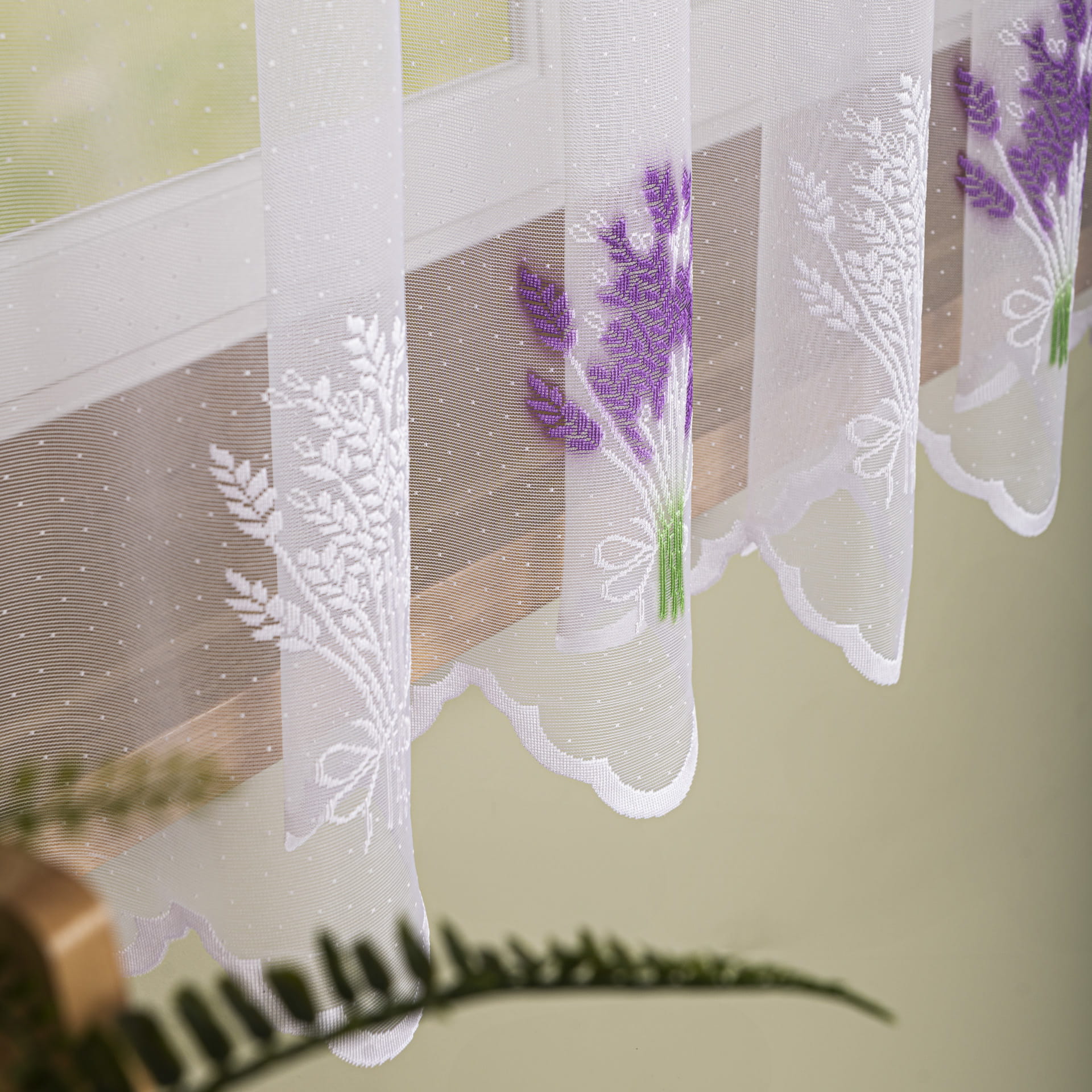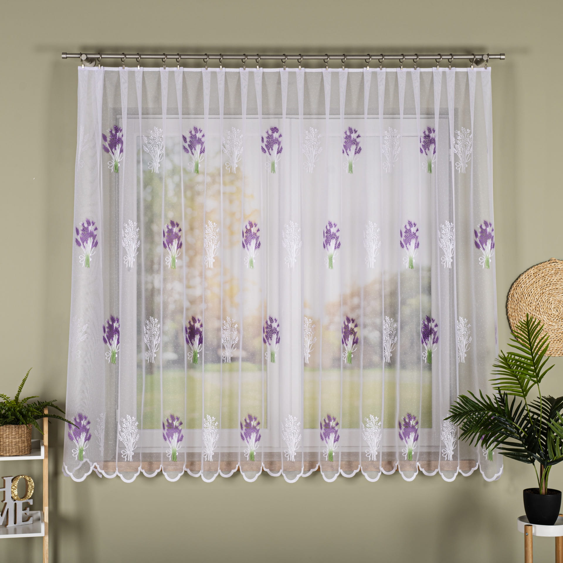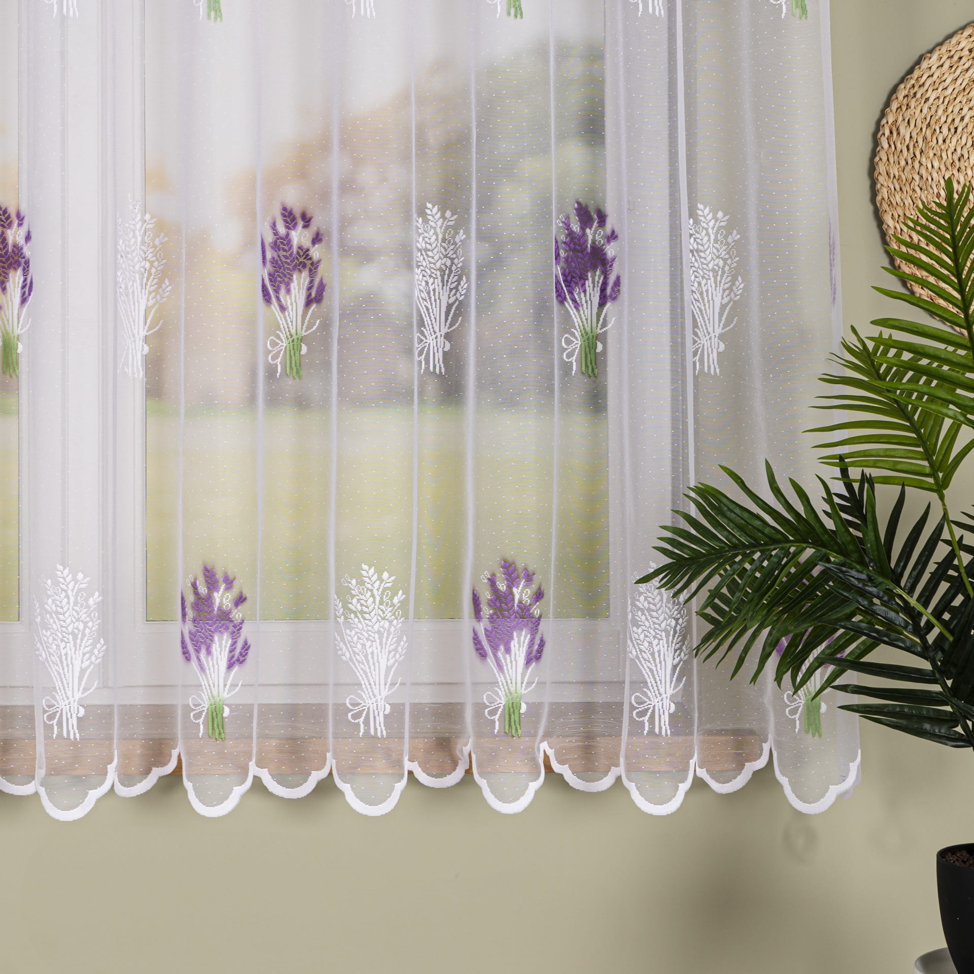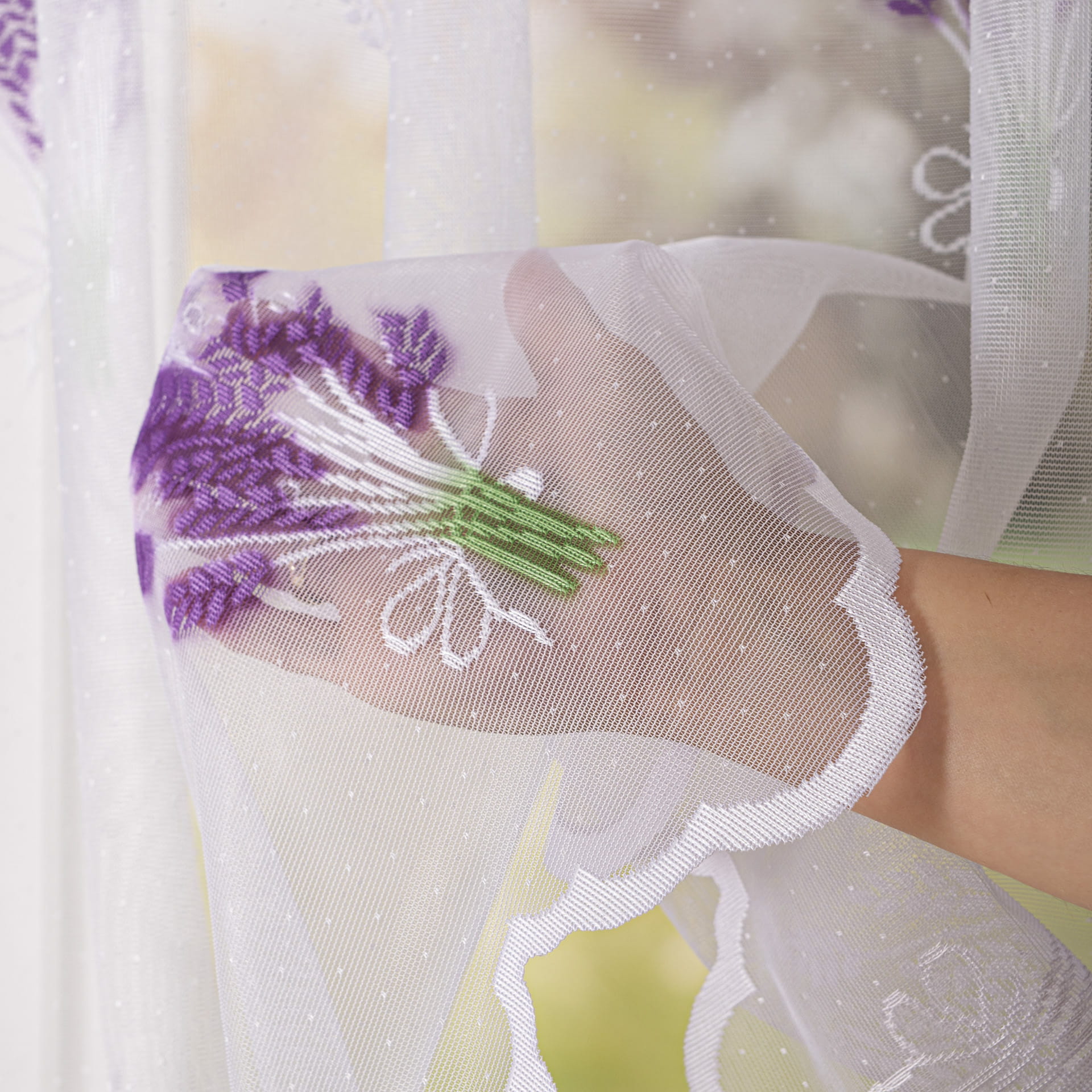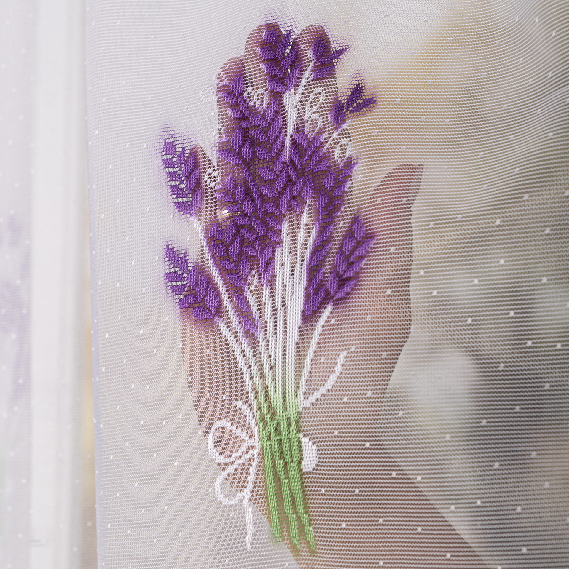 Elegancka firana żakardowa w kolorze białym, zdobiona drobnymi kropeczkami oraz haftem w formie bukietów lawendy. Wykonana z lekkiej, a zarazem wytrzymałej tkaniny subtelnie osłania okno, nie ograniczając dostępu naturalnego światła. Włókna poliestrowe sprawiają, iż tkanina jest trwała i łatwa w pielęgnacji. Nie wymaga prasowania - po praniu wystarczy wilgotną firanę zawiesić na karniszu.