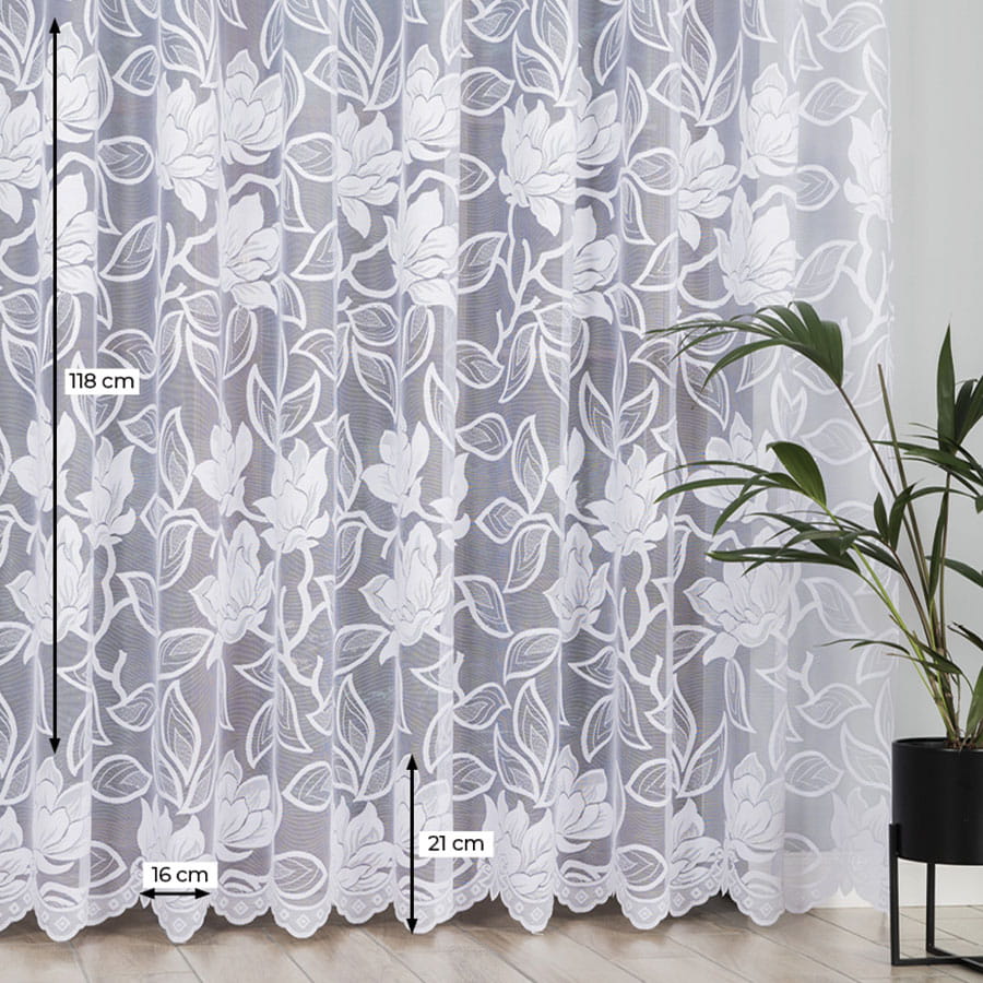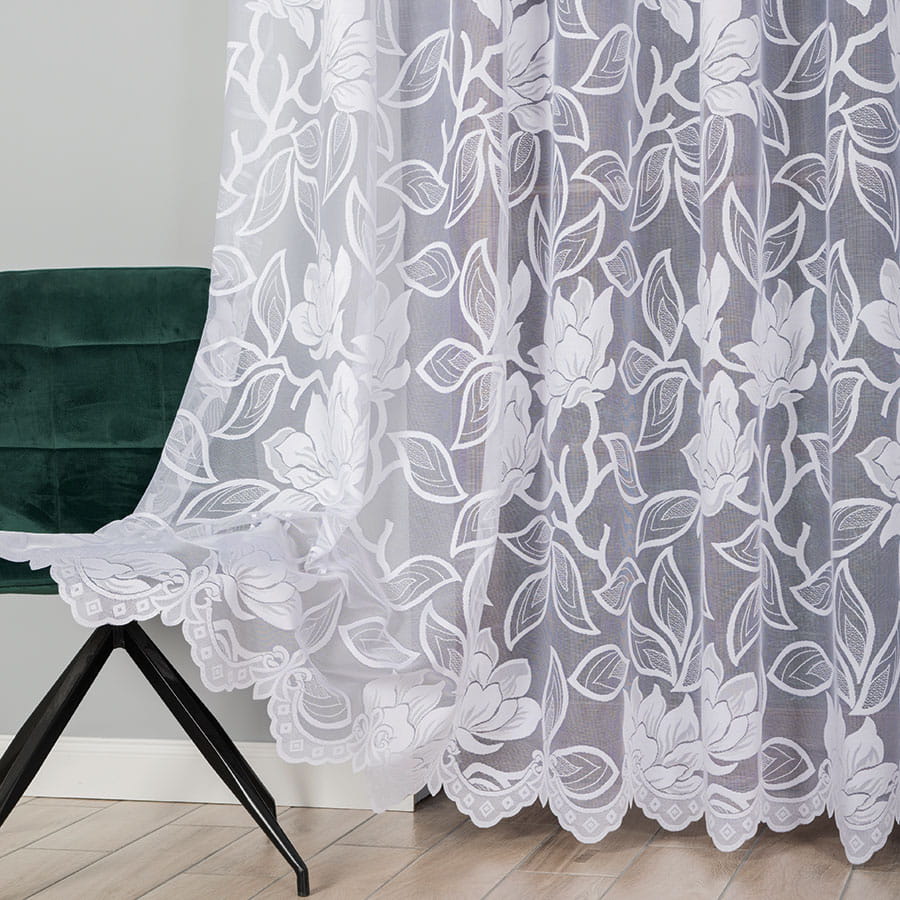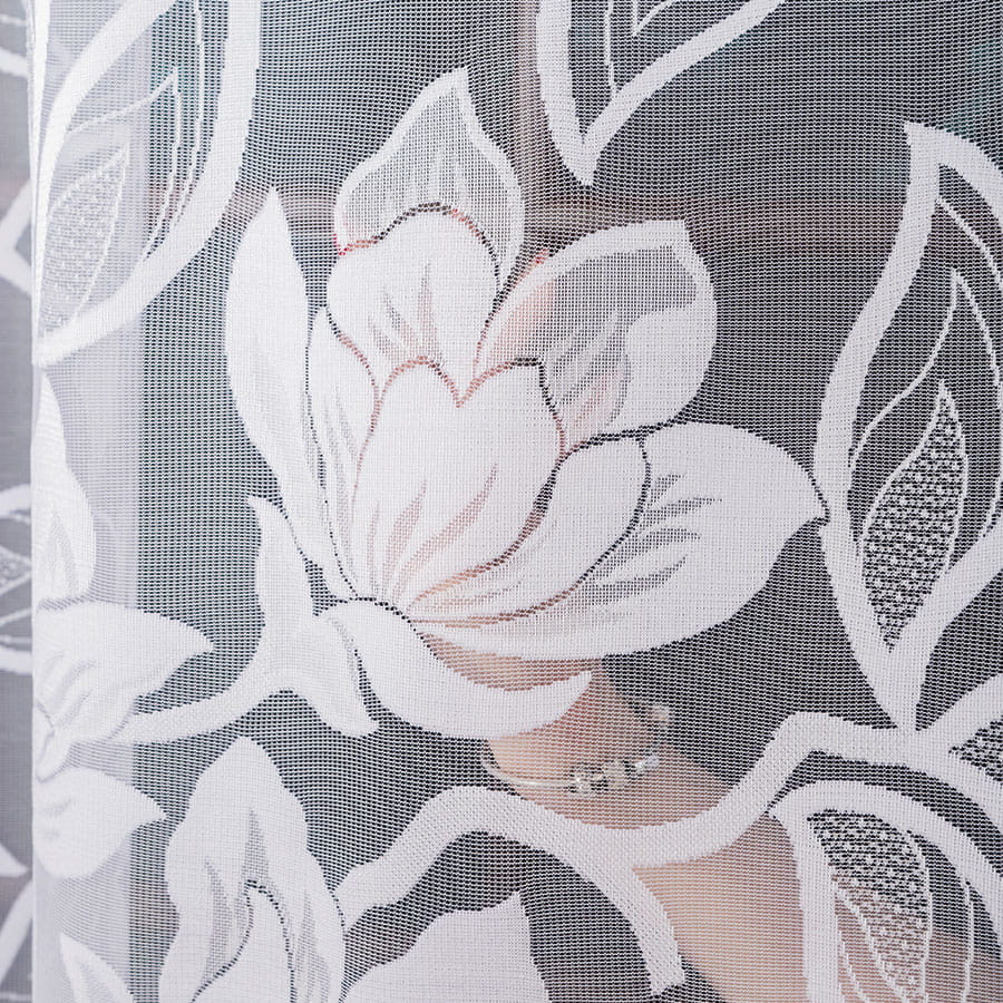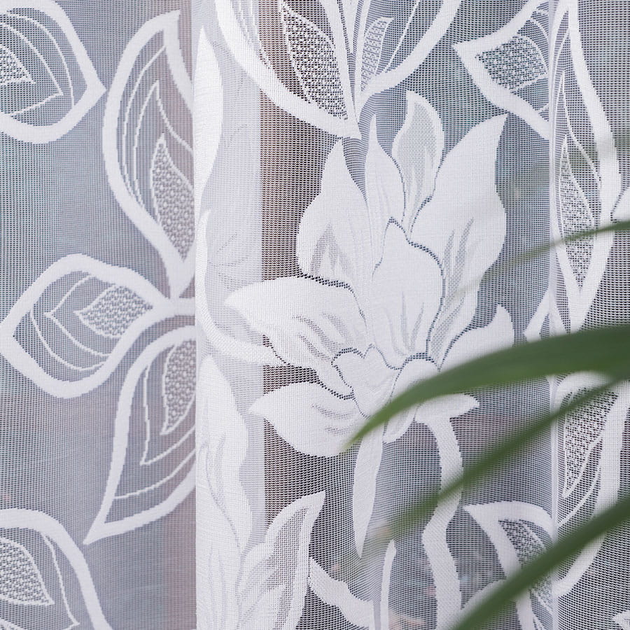 Firana żakardowa w klasycznym białym kolorze zachwyca wyjątkowym, kwiatowym wzorem, który zdobi całą powierzchnię tkaniny. Materiał bardzo dobrze przepuszcza naturalne światło, dzięki czemu wnętrze staje się jasne. Firana nie wymaga prasowania – po praniu wystarczy wilgotną zawiesić na karniszu, a materiał sam się rozprostuje.