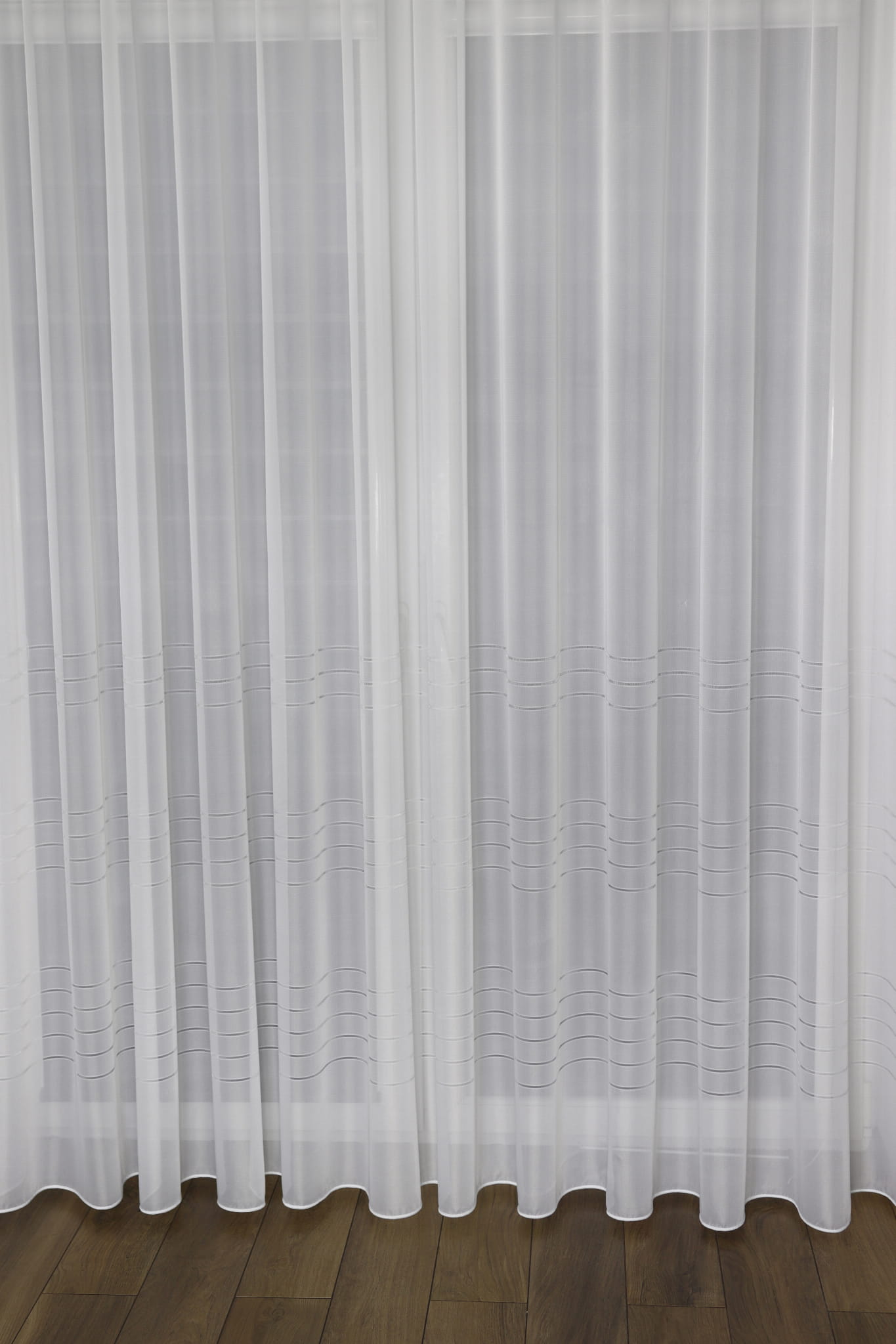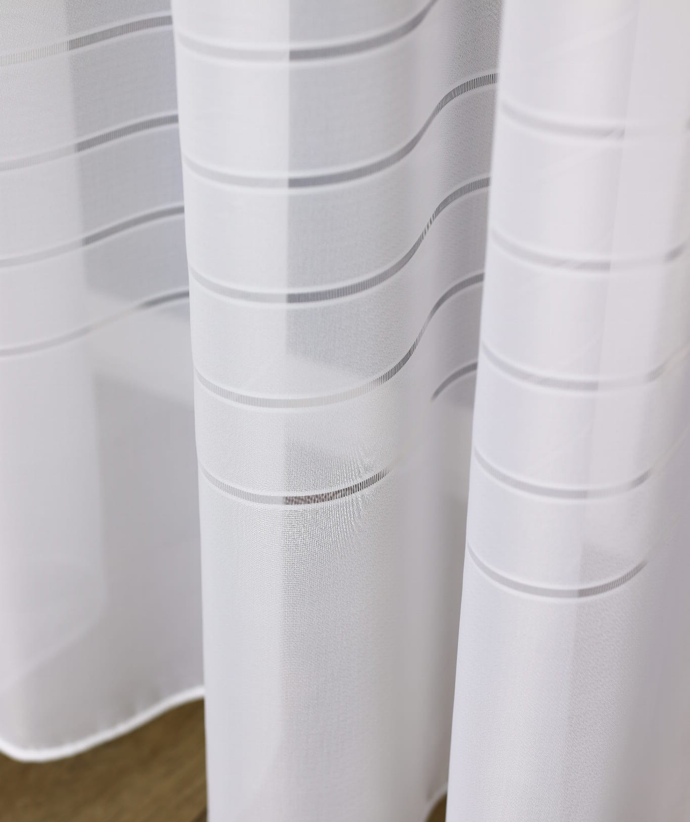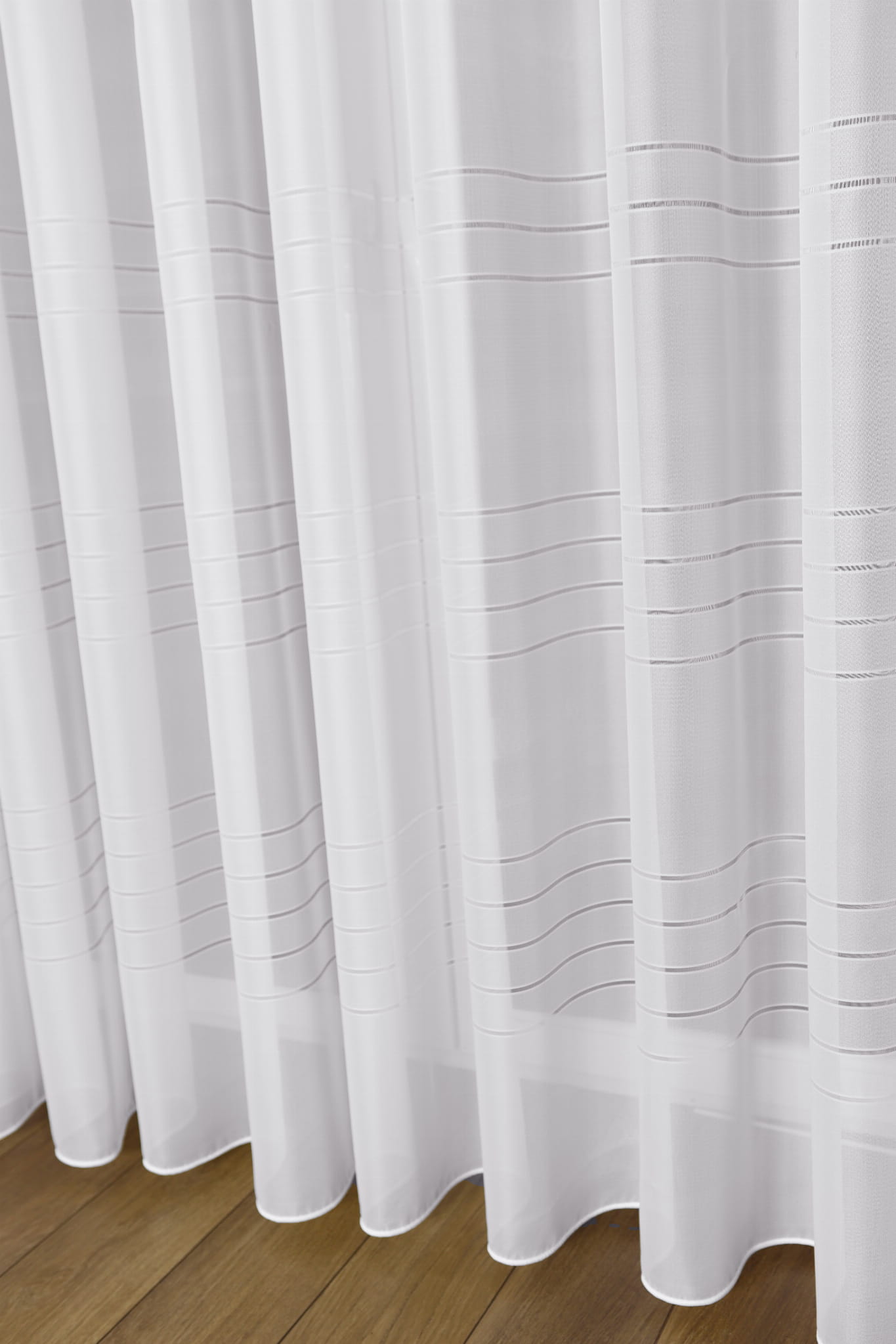 Lekka i elegancka firana z żorżety w klasycznej bieli. Materiał jest miękki, delikatny i “lejący”, dzięki czemu pięknie układa się w równe fale, subtelnie rozpraszając światło w pomieszczeniu. Główną ozdobę stanowią poziome pasy, które nadają wnętrzu nowoczesny, a zarazem ponadczasowy charakter. Strefa pasów sięga do wysokości około 100 cm, natomiast górna część firany pozostaje gładka i minimalistyczna.