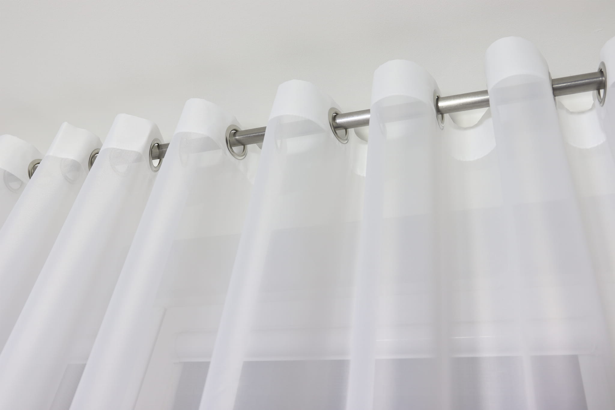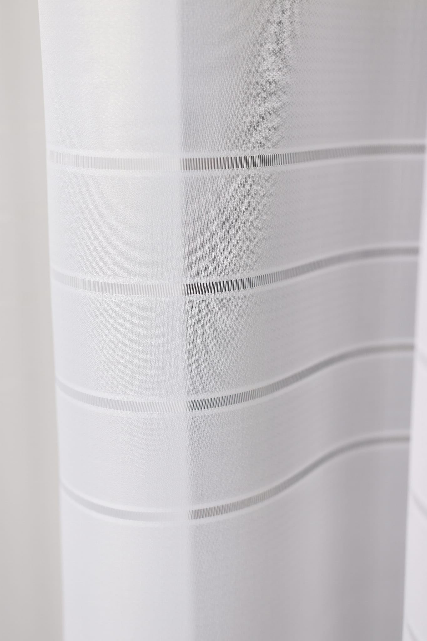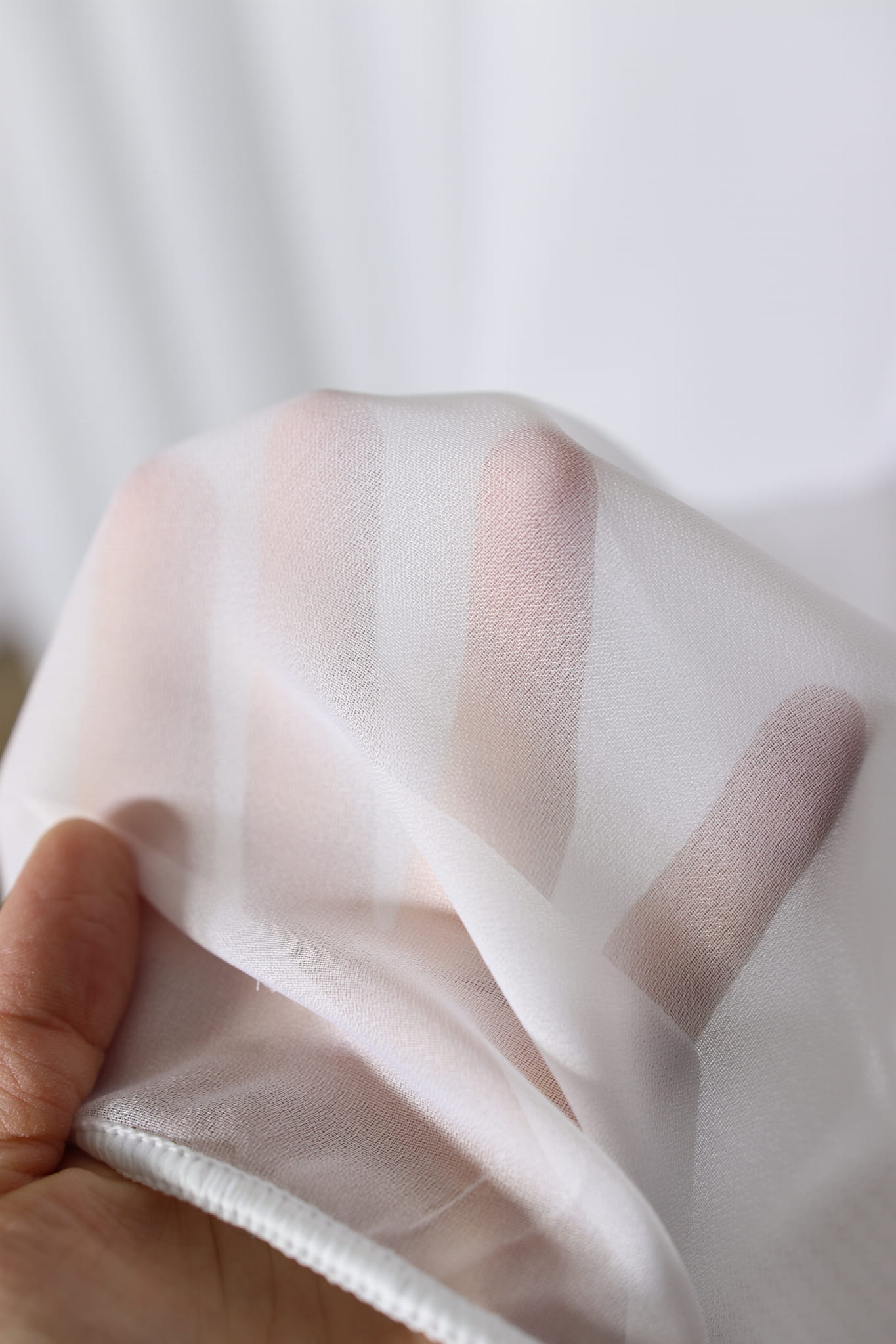 Lekka i elegancka firana z żorżety w klasycznej bieli. Materiał jest miękki, delikatny i “lejący”, dzięki czemu pięknie układa się w równe fale, subtelnie rozpraszając światło w pomieszczeniu. Główną ozdobę stanowią poziome pasy, które nadają wnętrzu nowoczesny, a zarazem ponadczasowy charakter. Strefa pasów sięga do wysokości około 100 cm, natomiast górna część firany pozostaje gładka i minimalistyczna.