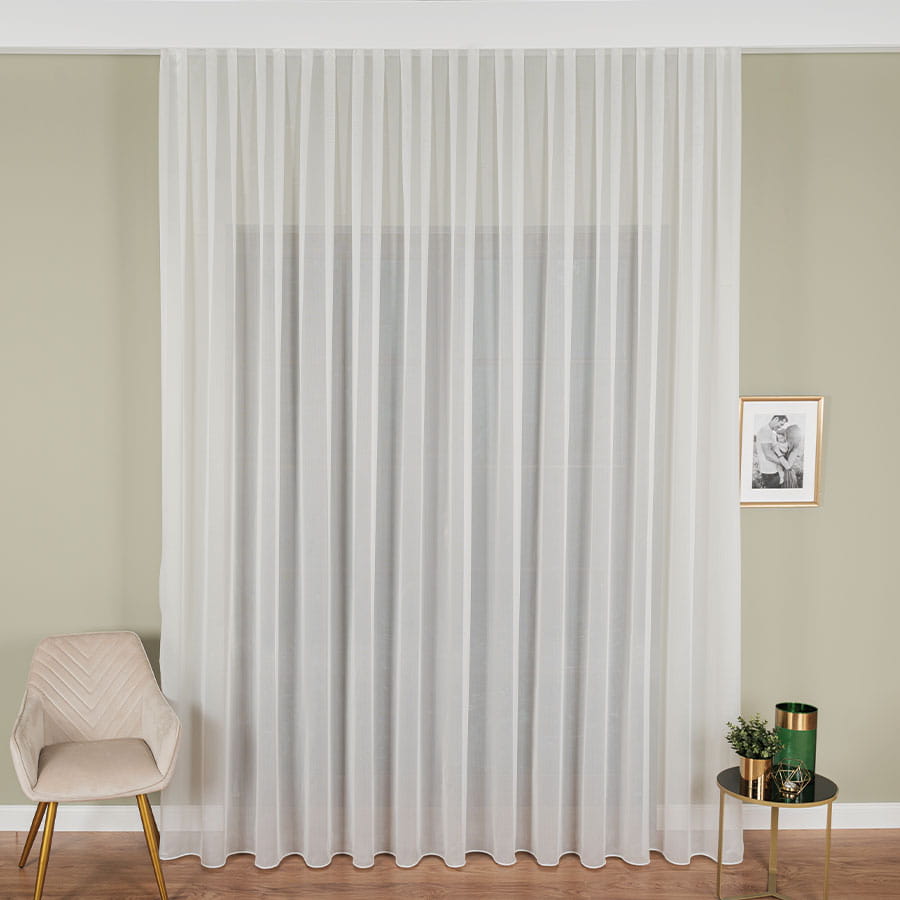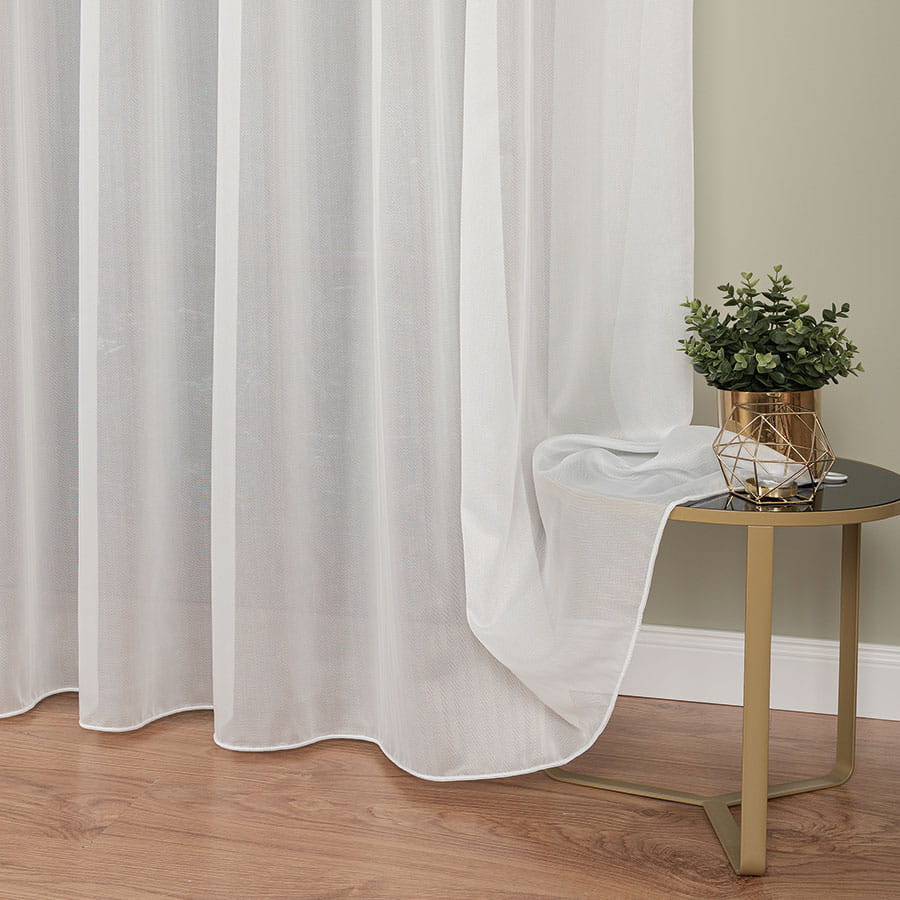 Brzeg górny jest wykończony fabrycznie, dołem jest ołowianka dodatkowo obciążająca firanę aby układała równomierne fale. Tkanina ta jest bardzo łatwa w prasowaniu i praniu, charakteryzuje się miękkością co nie sprawia problemów przy dekorowaniu wnętrza.