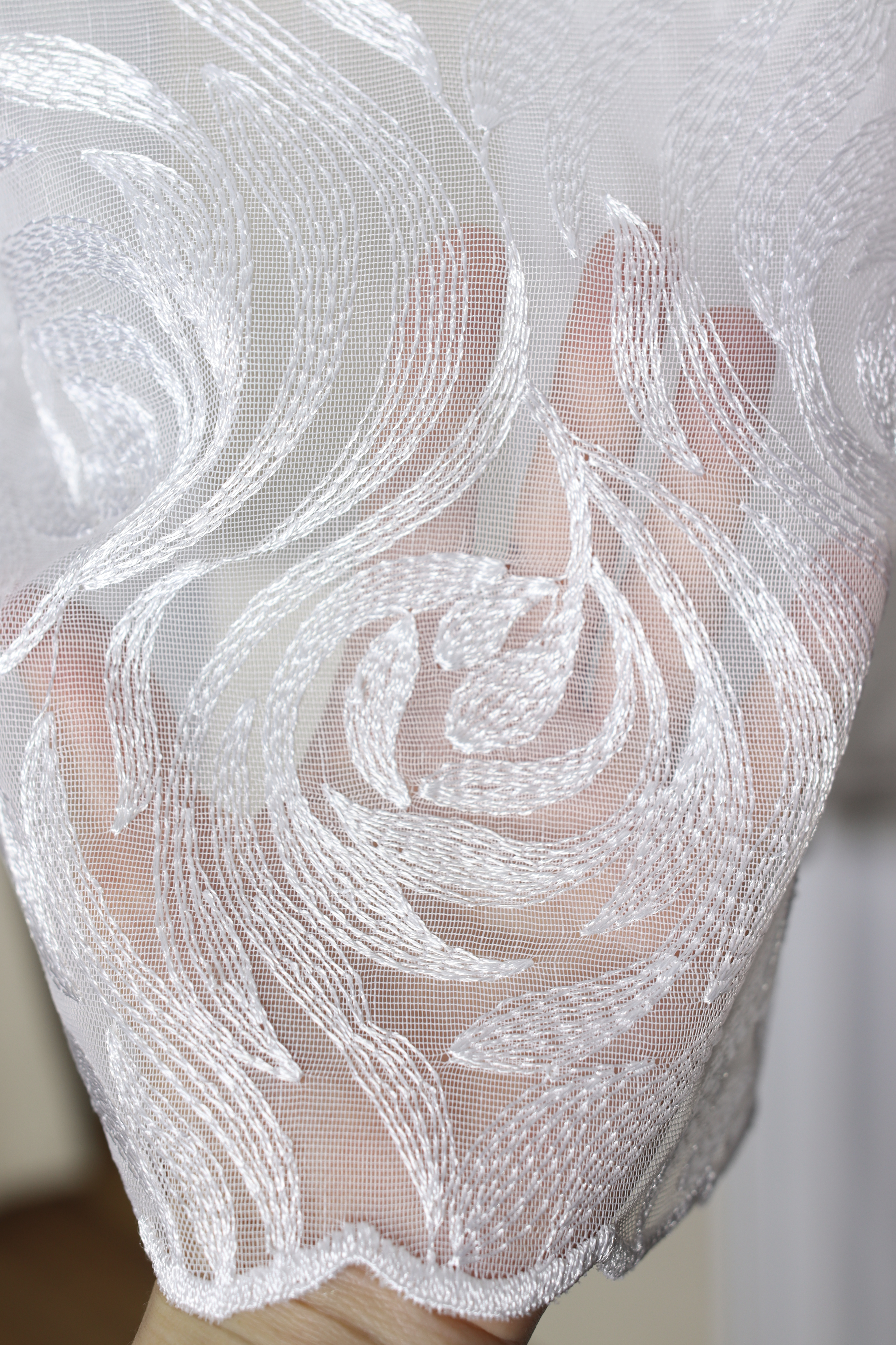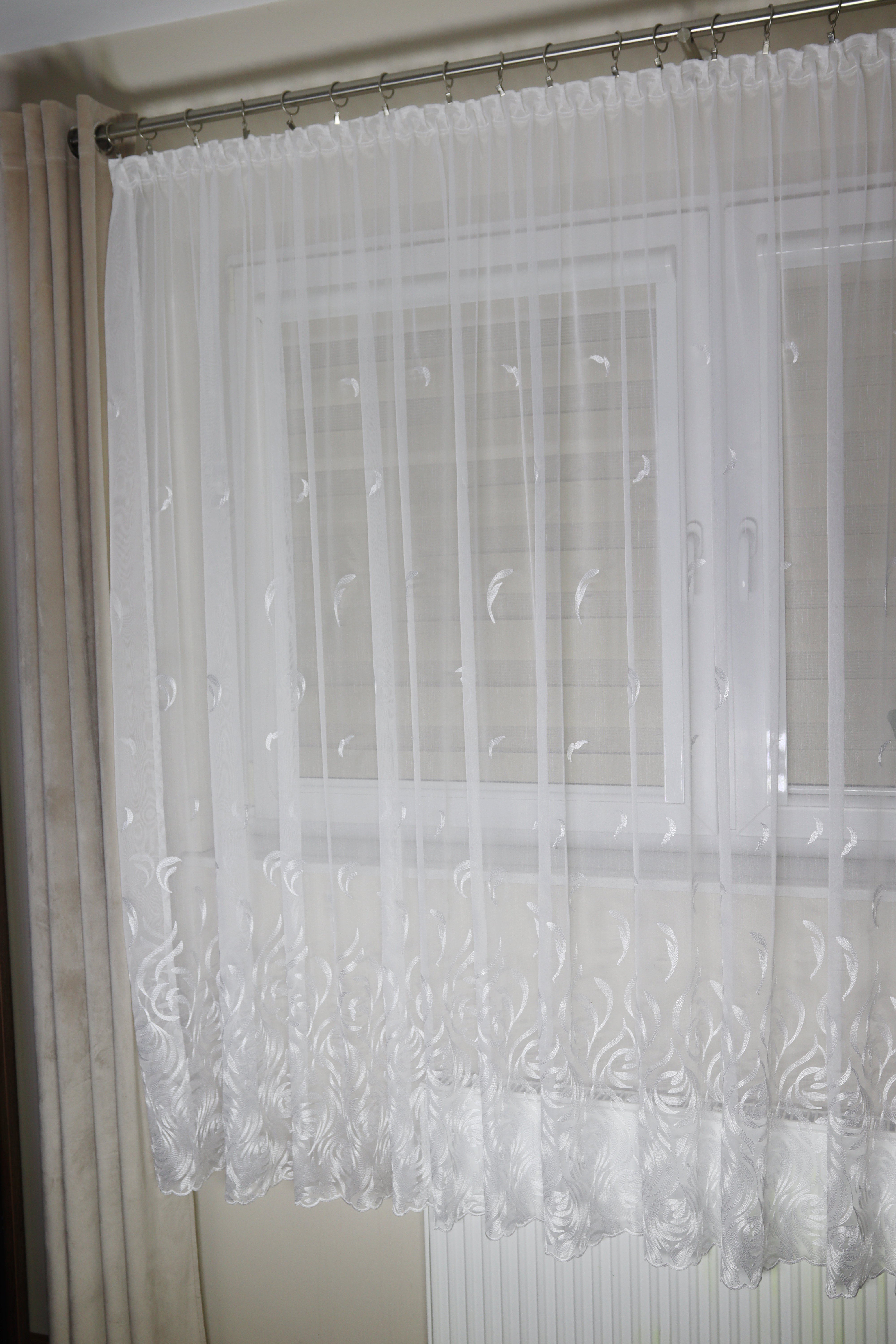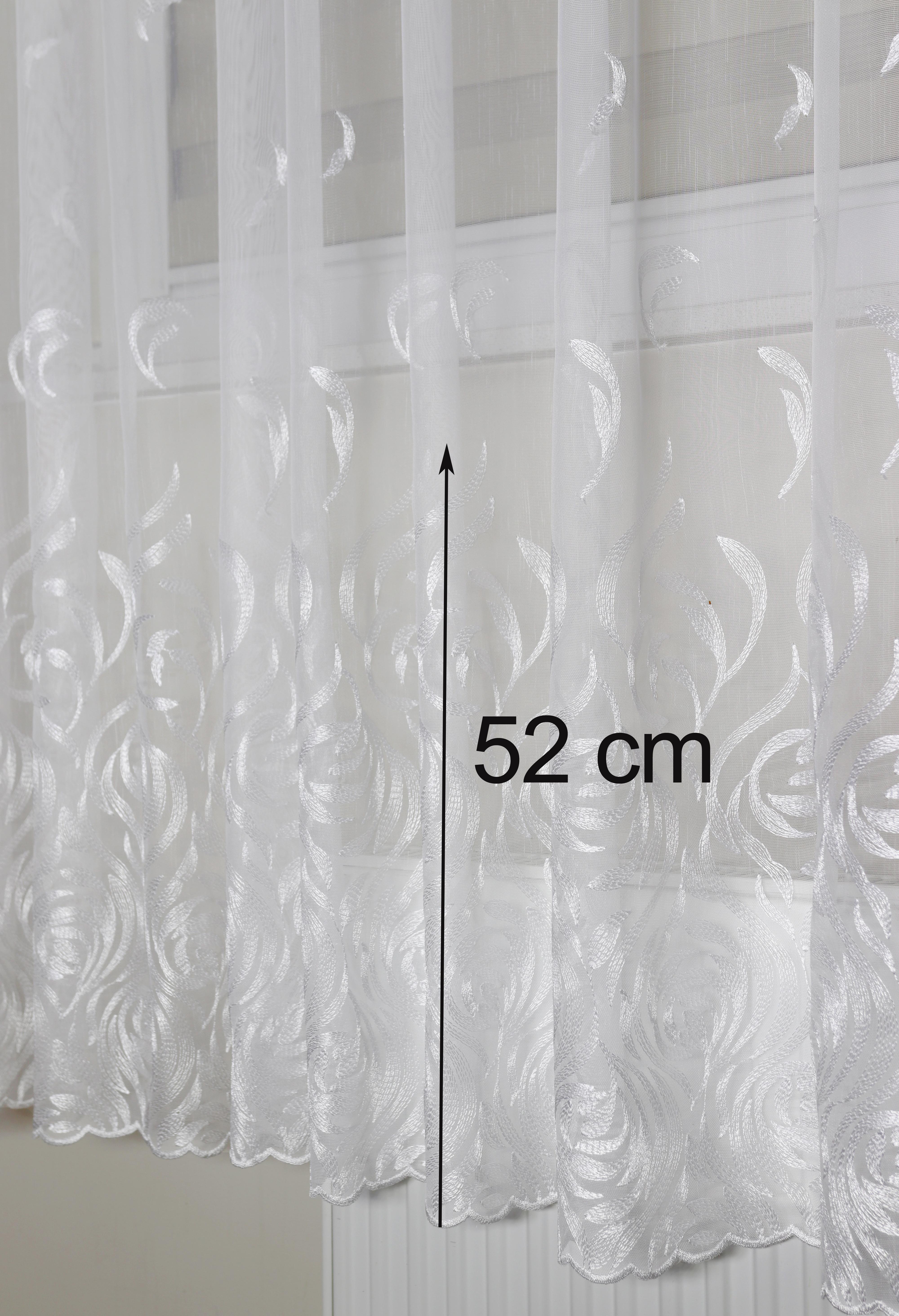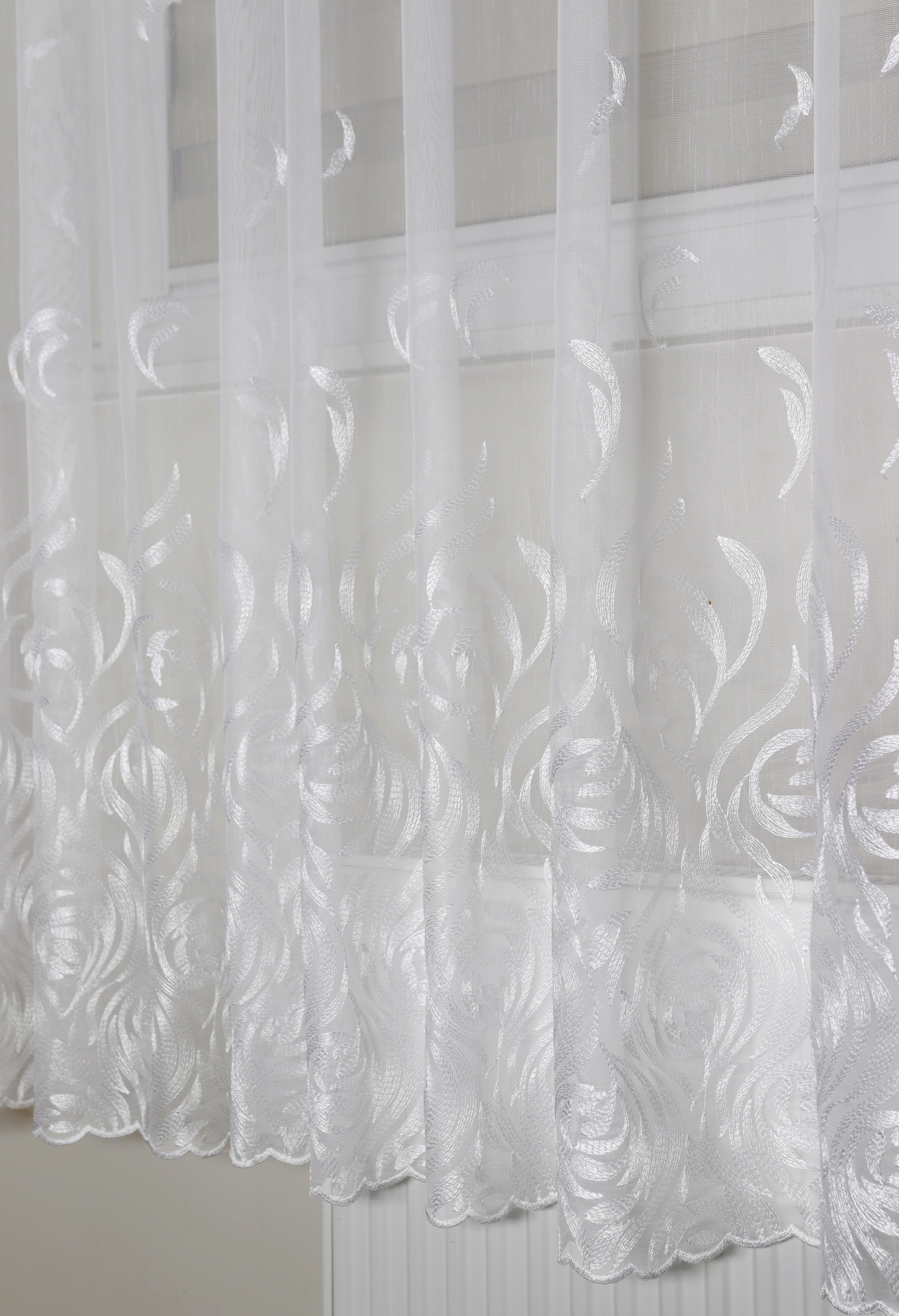 Środkową część firany zdobią haftowane aplikacje przypominające kształtem delikatne listki. Rozmieszczone symetrycznie na całej wysokości, nadają dekoracji wyjątkowej lekkości. Z kolei dolna część została wykończona gęstym, misternym haftem, który podkreśla jej dekoracyjny charakter.
