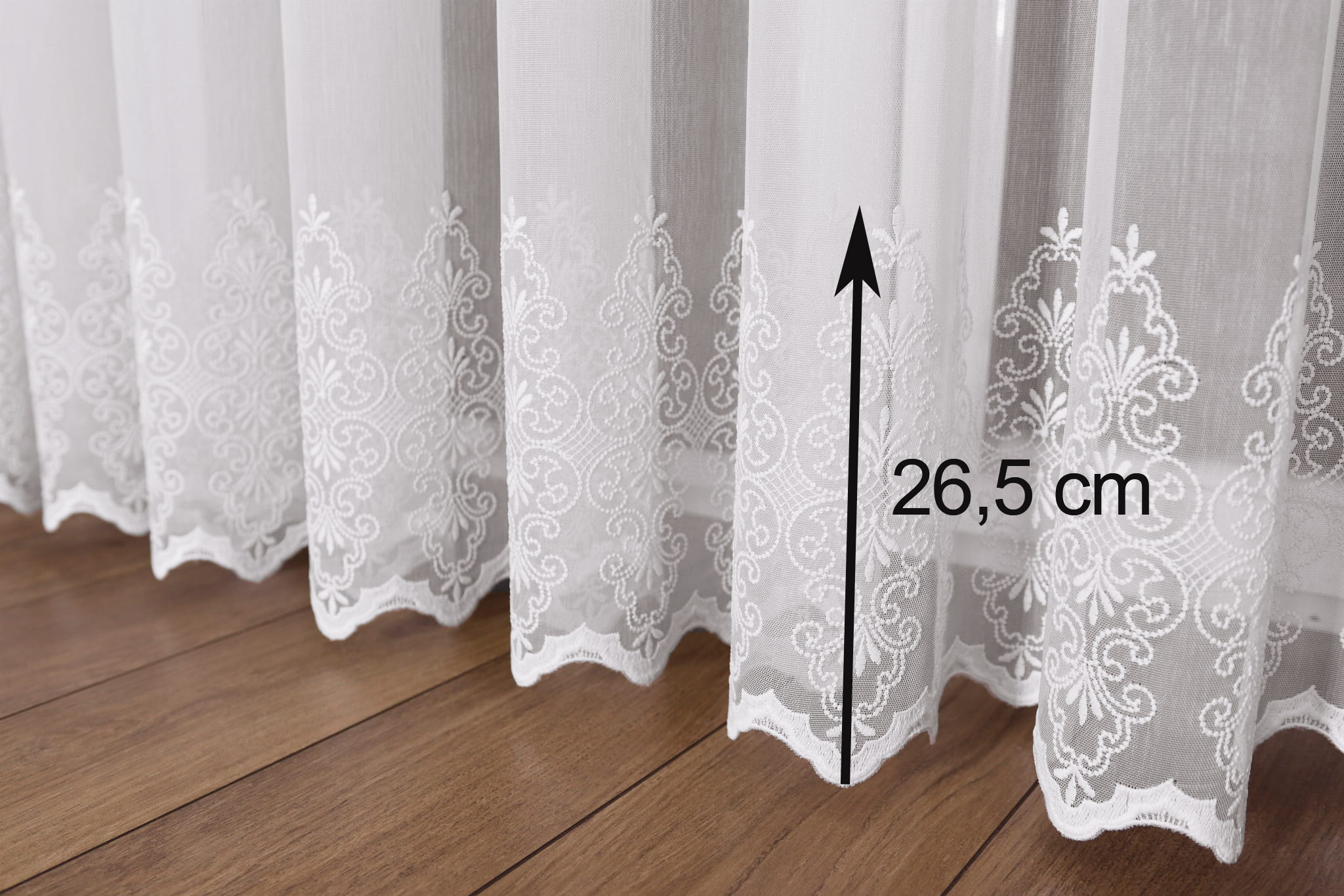 Dół firany zdobi delikatny, a zarazem efektowny haft, który dodaje całości charakteru. To elegancki akcent, idealnie dopełniający wygląd okna.