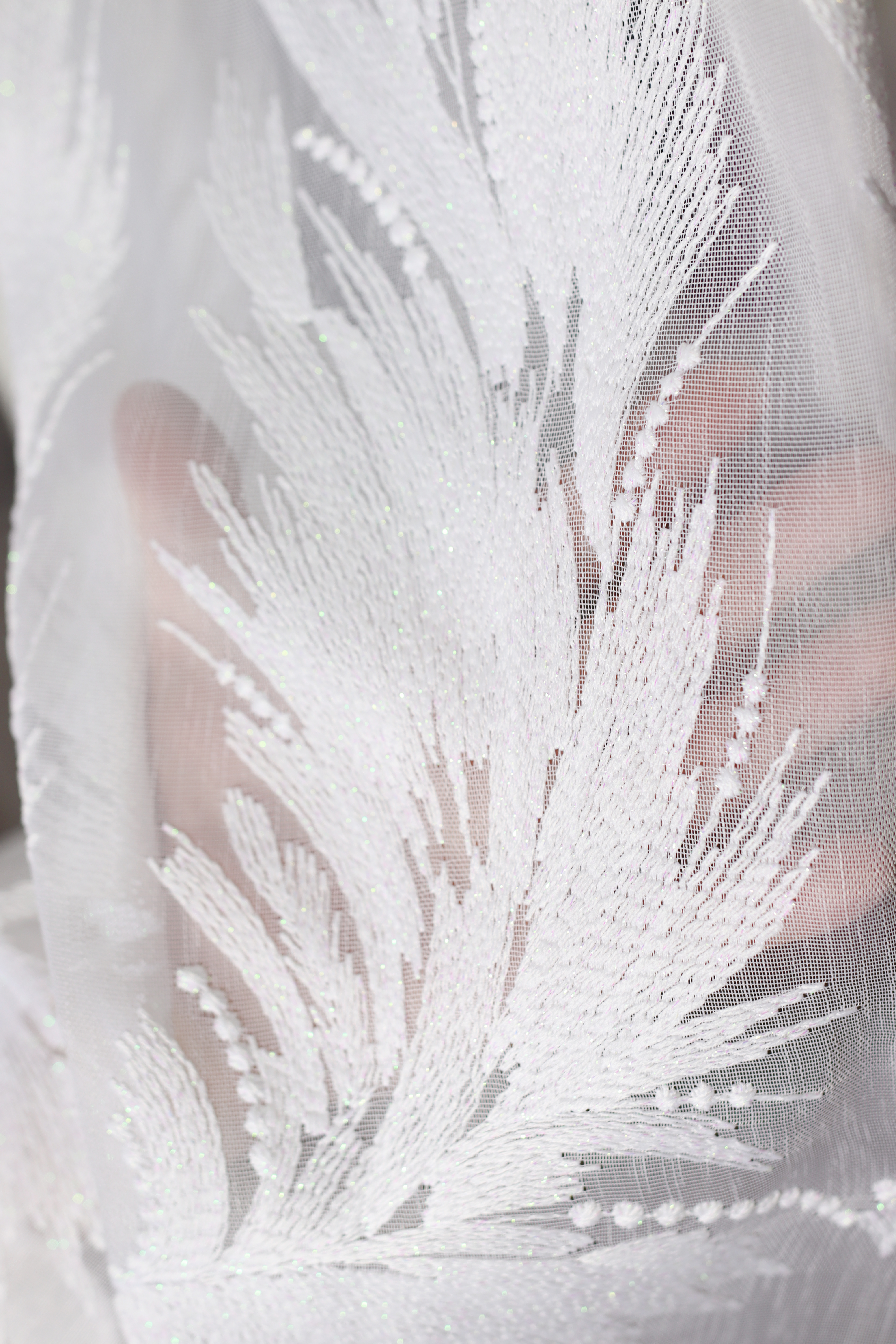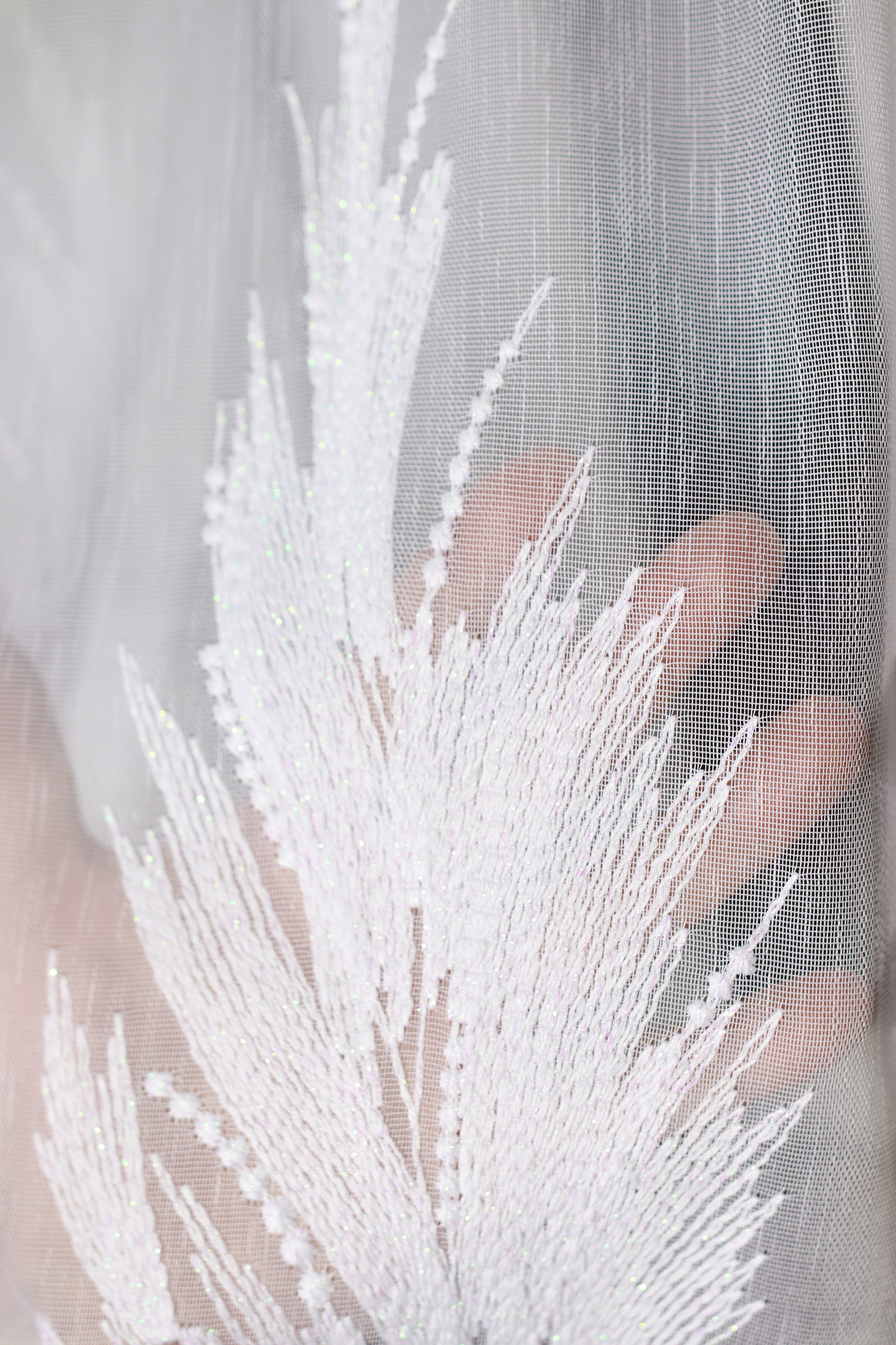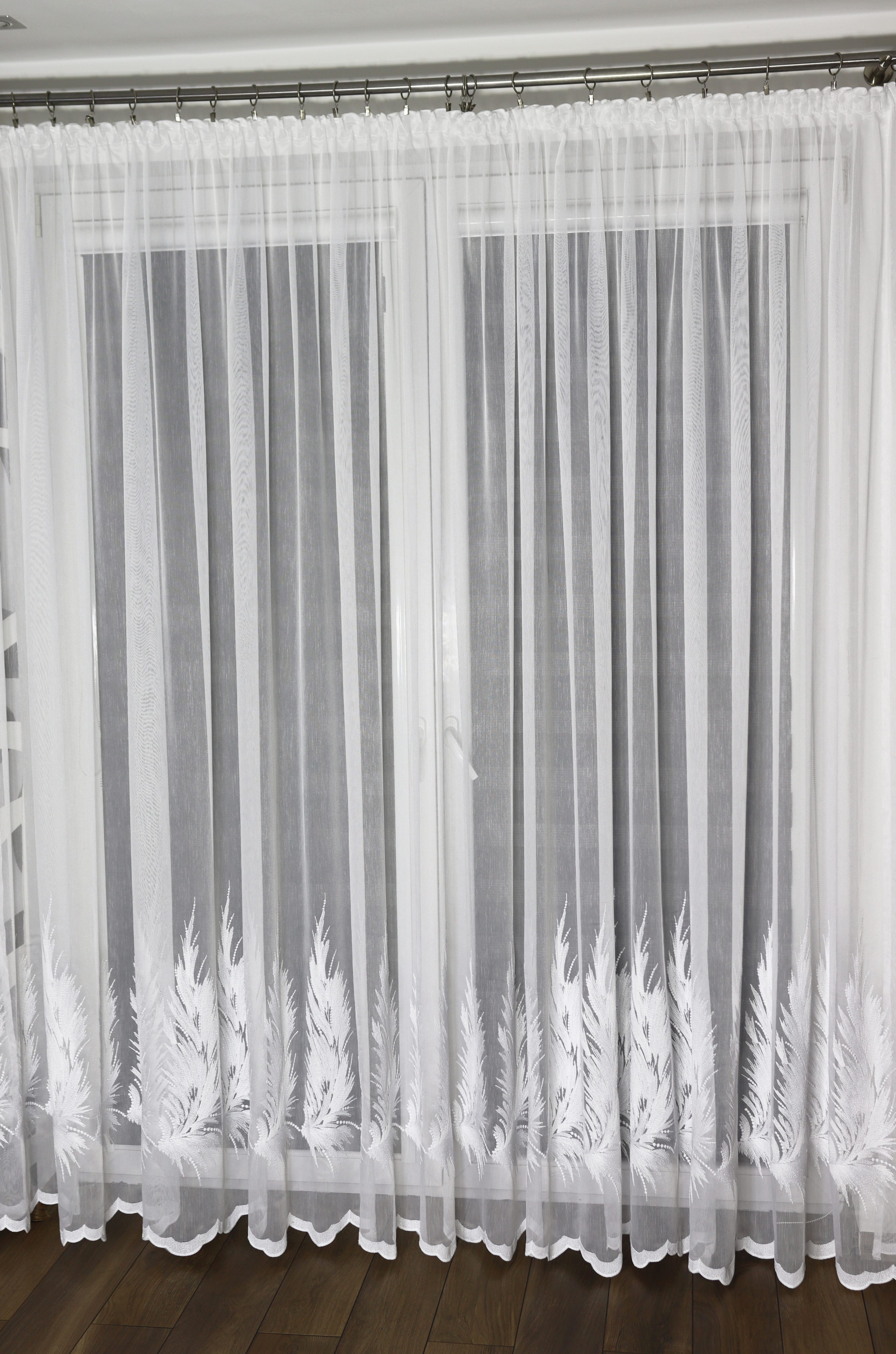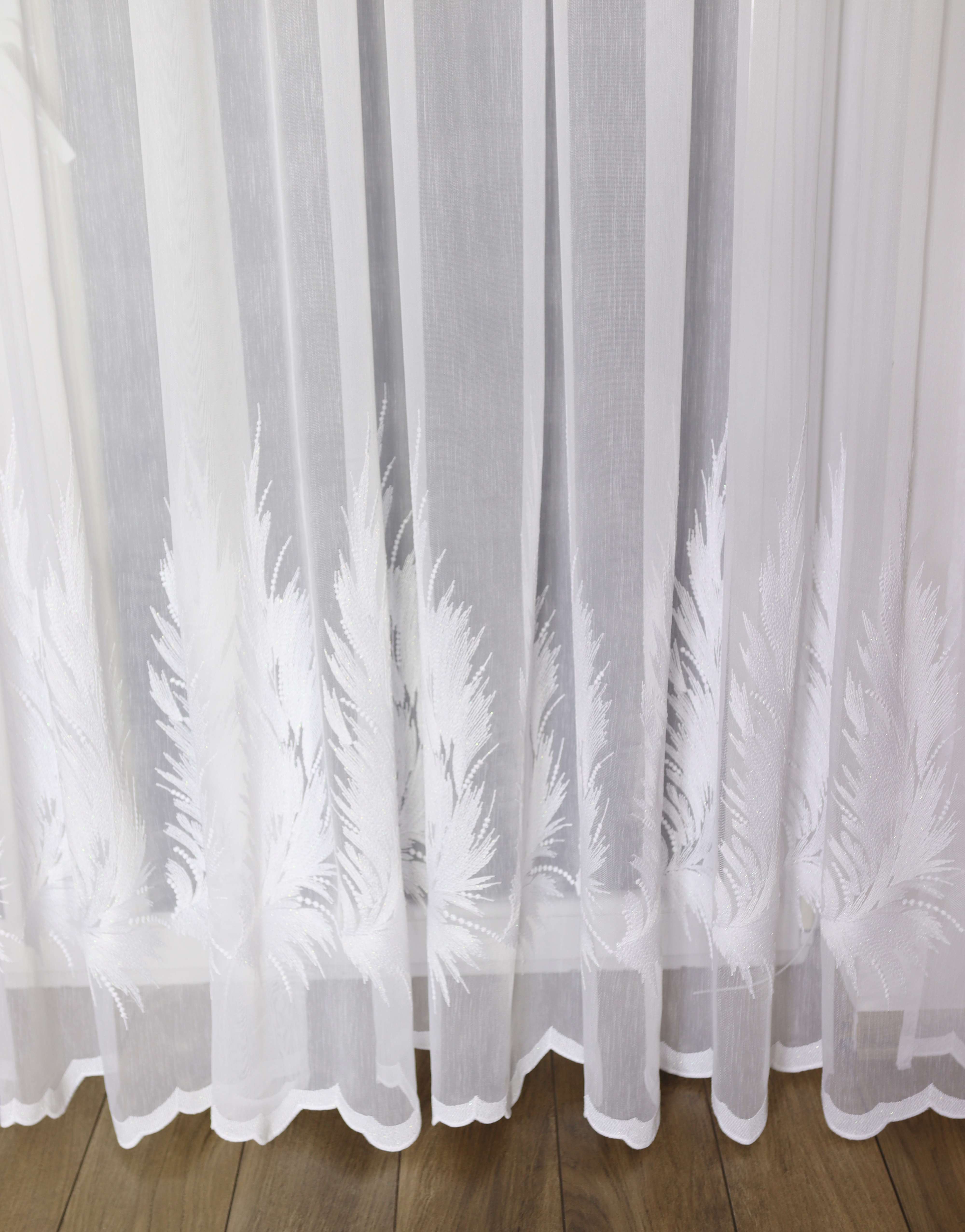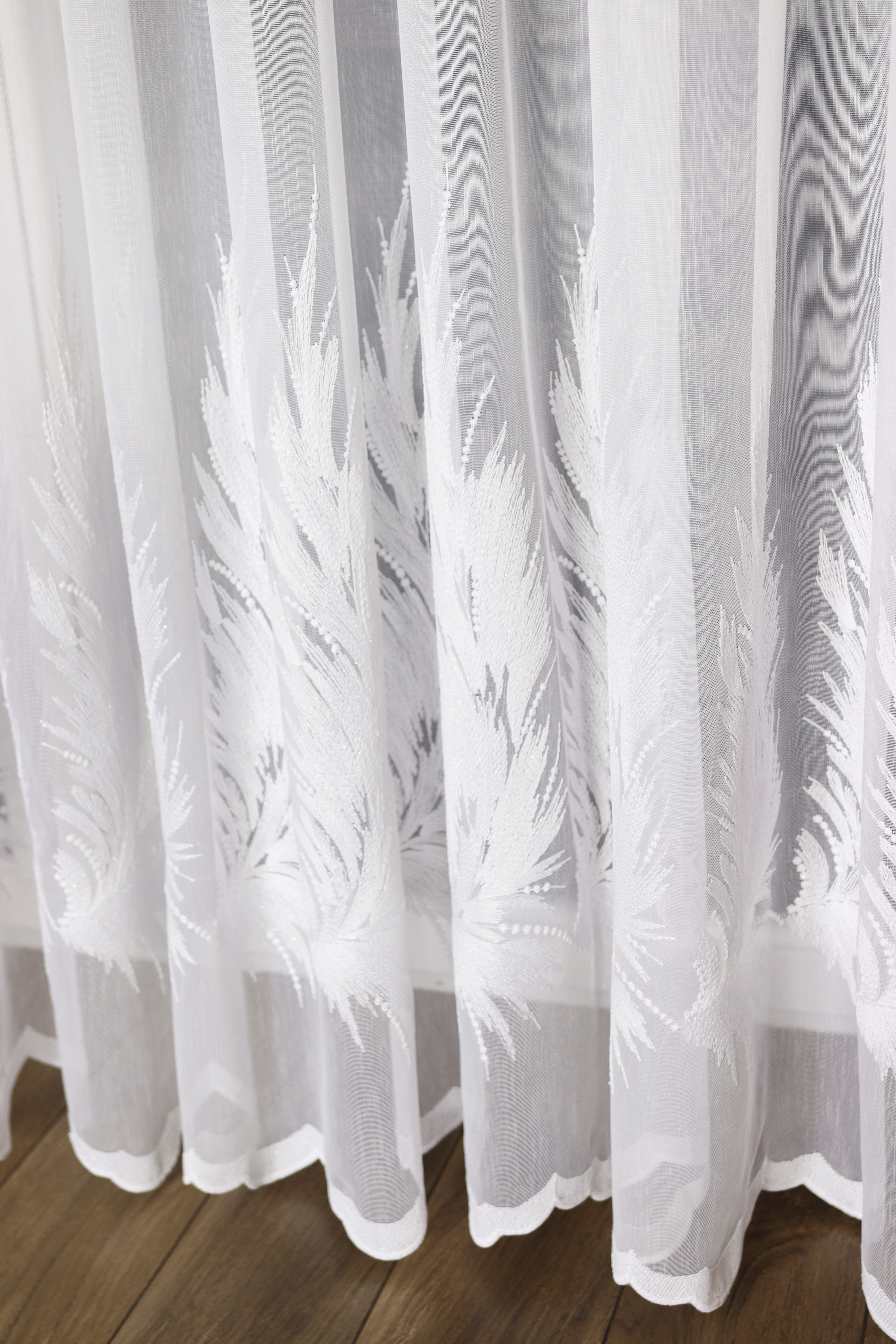 Dolną część firany zdobi dekoracyjny haft przypominający liście paproci o wysokości 60 cm. Wzór dodatkowo podkreślono błyszczącą nicią, co nadaje całości elegancji i subtelnego połysku.