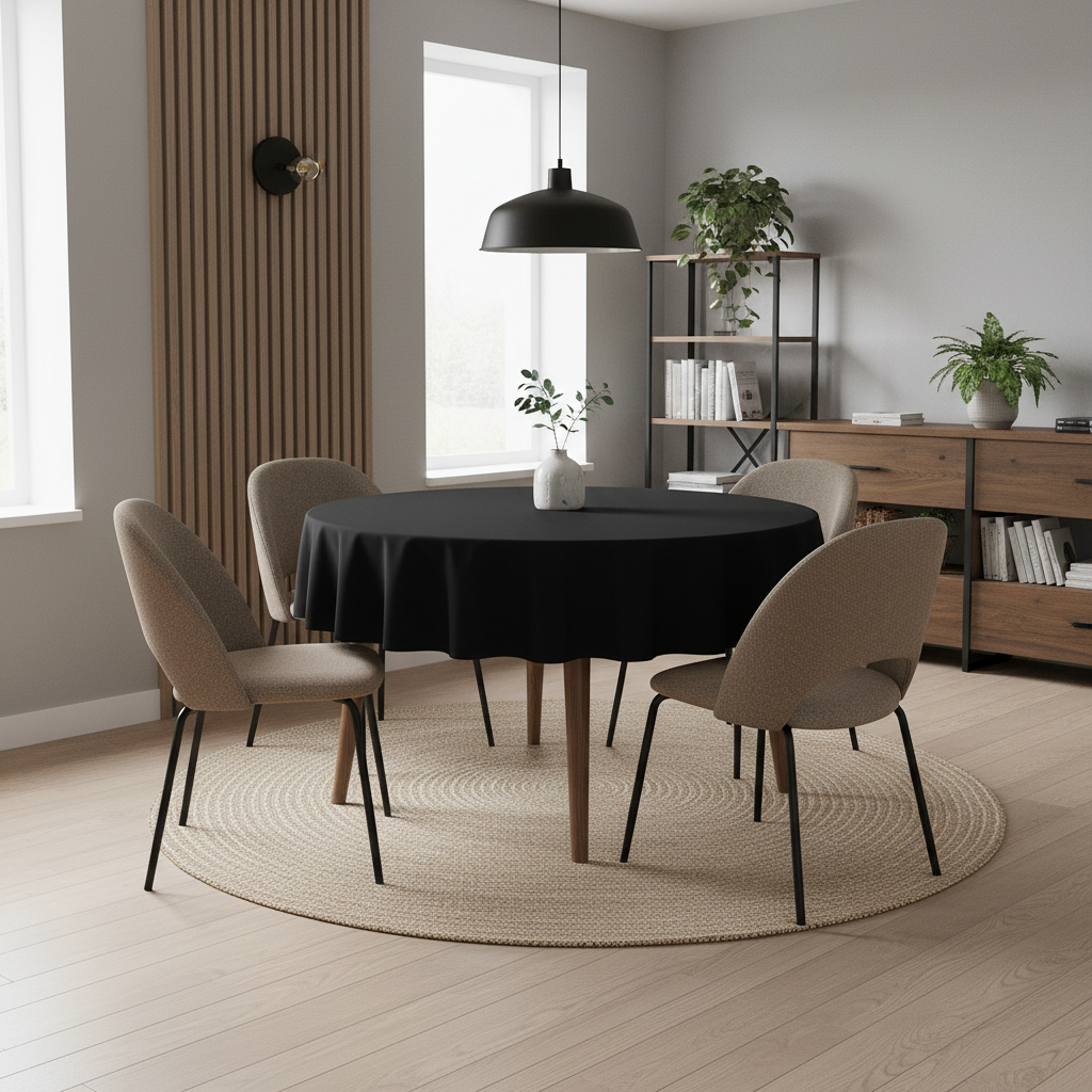 Klasyczna czerń nadaje całości elegancji i uniwersalnego charakteru, sprawiając, że obrus sprawdzi się zarówno przy codziennych posiłkach jak i podczas wyjątkowych uroczystości.