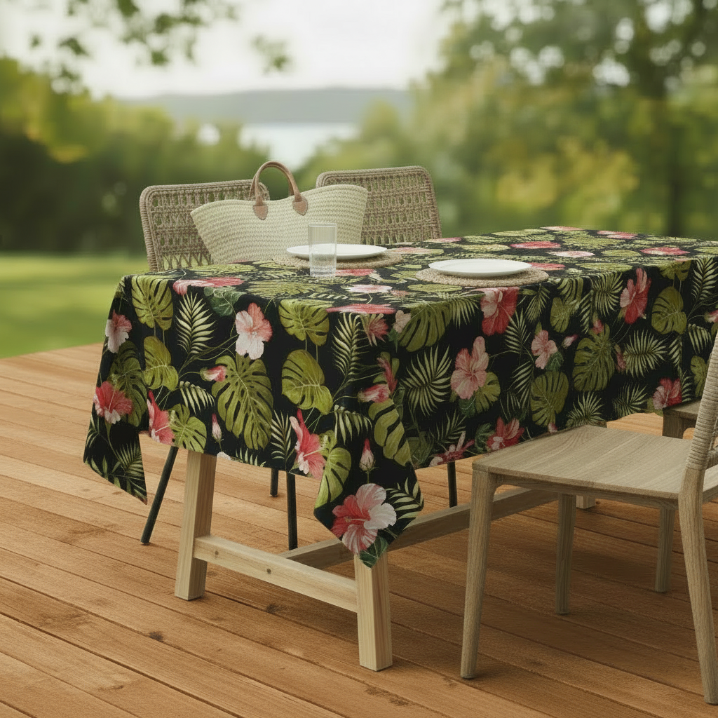 Obrus wodoodporny liście monstery i tropikalne kwiaty to efektowna ozdoba stołu, która doskonale sprawdzi się na tarasie, balkonie czy też w ogrodzie. Wykonany z wysokiej jakości tkaniny pokrytej specjalną powłoką wodoodporną skutecznie chroni stół przed zalaniem i plamami. Materiał wyróżnia się dużą wytrzymałością na rozciąganie, jest odporny na zmienne warunki atmosferyczne, a przy tym łatwy w pielęgnacji — wystarczy przetrzeć go wilgotną ściereczką, by znów wyglądał jak nowy.
