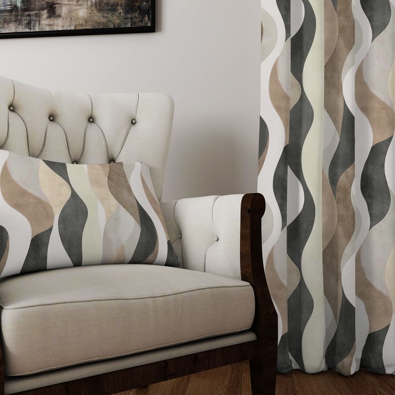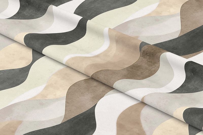 Miękka tkanina drukowana o nowoczesnym, falistym wzorze przyciąga wzrok i dodaje aranżacji elegancji. Połączenie brązu, beżu, bieli oraz grafitu tworzy modną kompozycję, którą łatwo dopasować zarówno do delikatnych, przytulnych przestrzeni, jak i bardziej wyrazistych wnętrz. Przyjemny w dotyku materiał dobrze się układa zapewniając komfort użytkowania.