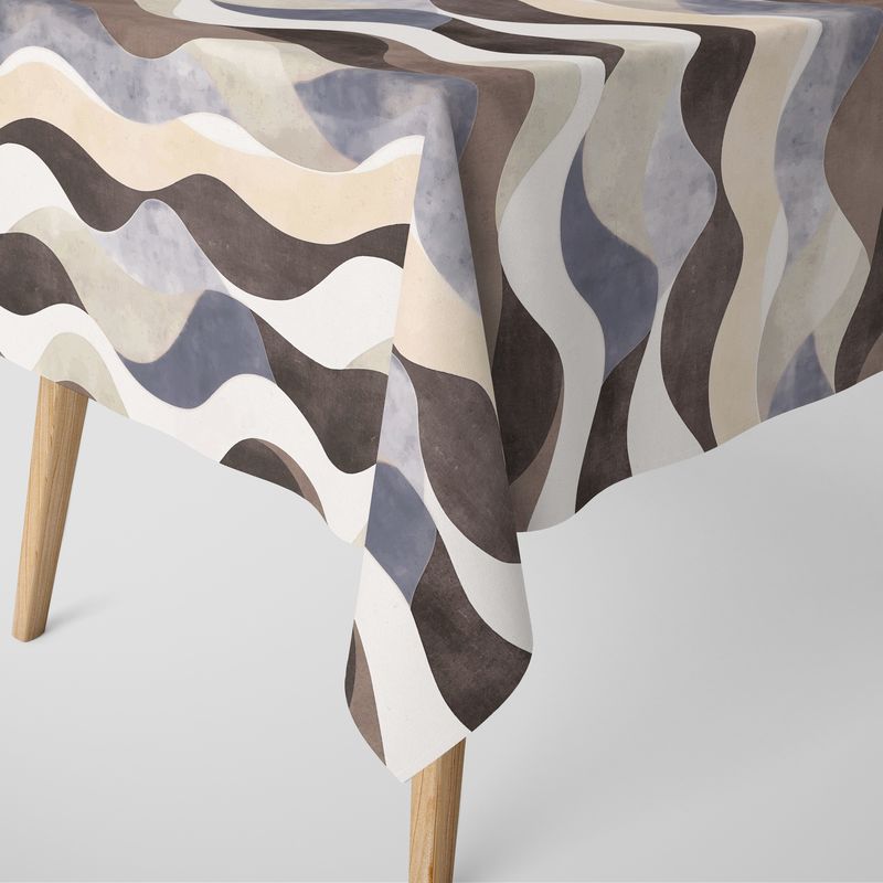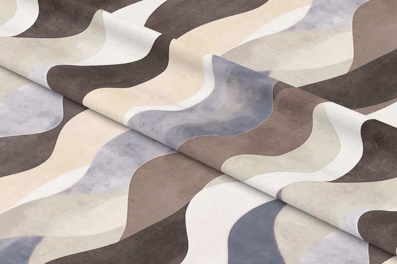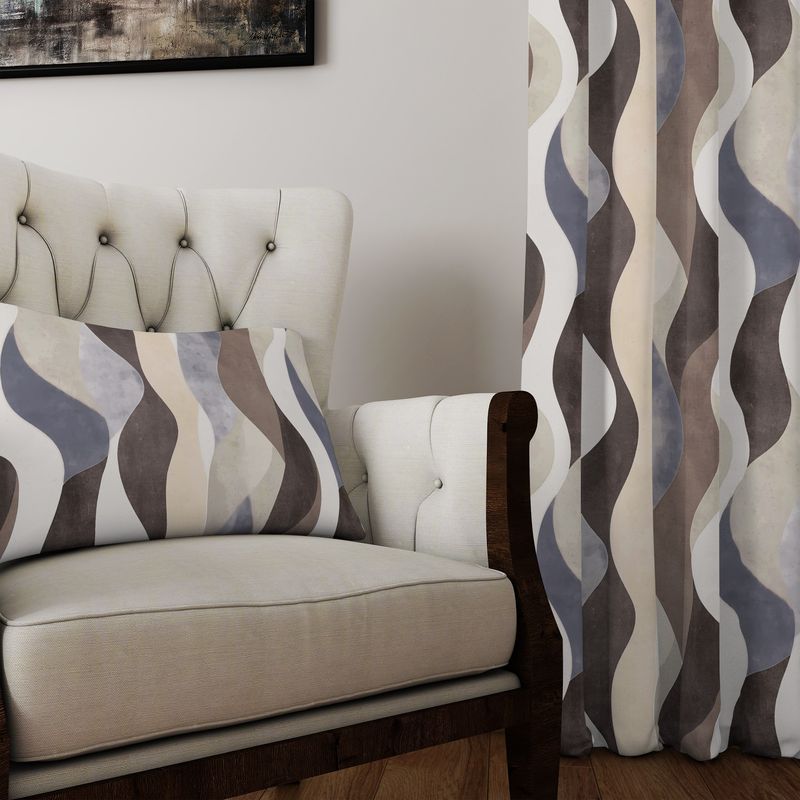 Miękka tkanina drukowana o nowoczesnym, falistym wzorze przyciąga wzrok i dodaje aranżacji elegancji. Połączenie brązu, beżu oraz niebieskiego tworzy modną kompozycję, którą łatwo dopasować zarówno do delikatnych, przytulnych przestrzeni, jak i bardziej wyrazistych wnętrz. Przyjemny w dotyku materiał dobrze się układa zapewniając komfort użytkowania.