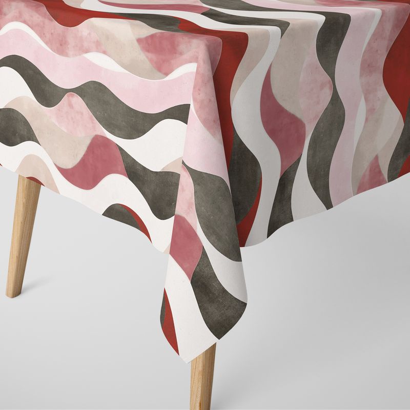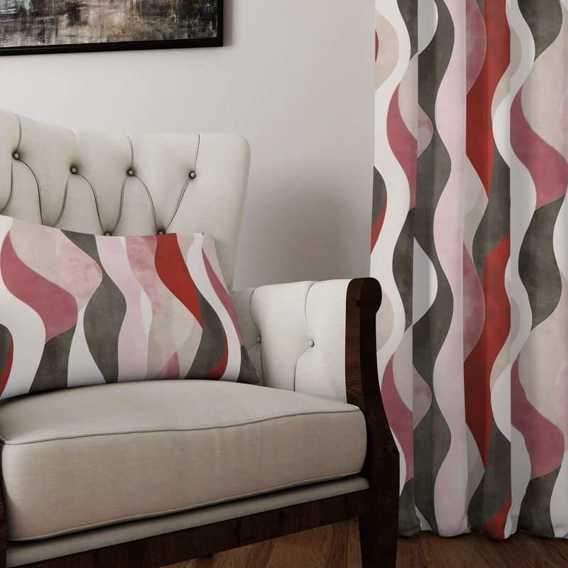Miękka tkanina drukowana o nowoczesnym, falistym wzorze przyciąga wzrok i dodaje aranżacji elegancji. Zestawienie pudrowego różu, beżu, bieli, czerwieni oraz grafitu tworzy modną kompozycję, którą łatwo dopasować zarówno do delikatnych, przytulnych przestrzeni, jak i bardziej wyrazistych wnętrz. Przyjemny w dotyku materiał dobrze się układa zapewniając komfort użytkowania.