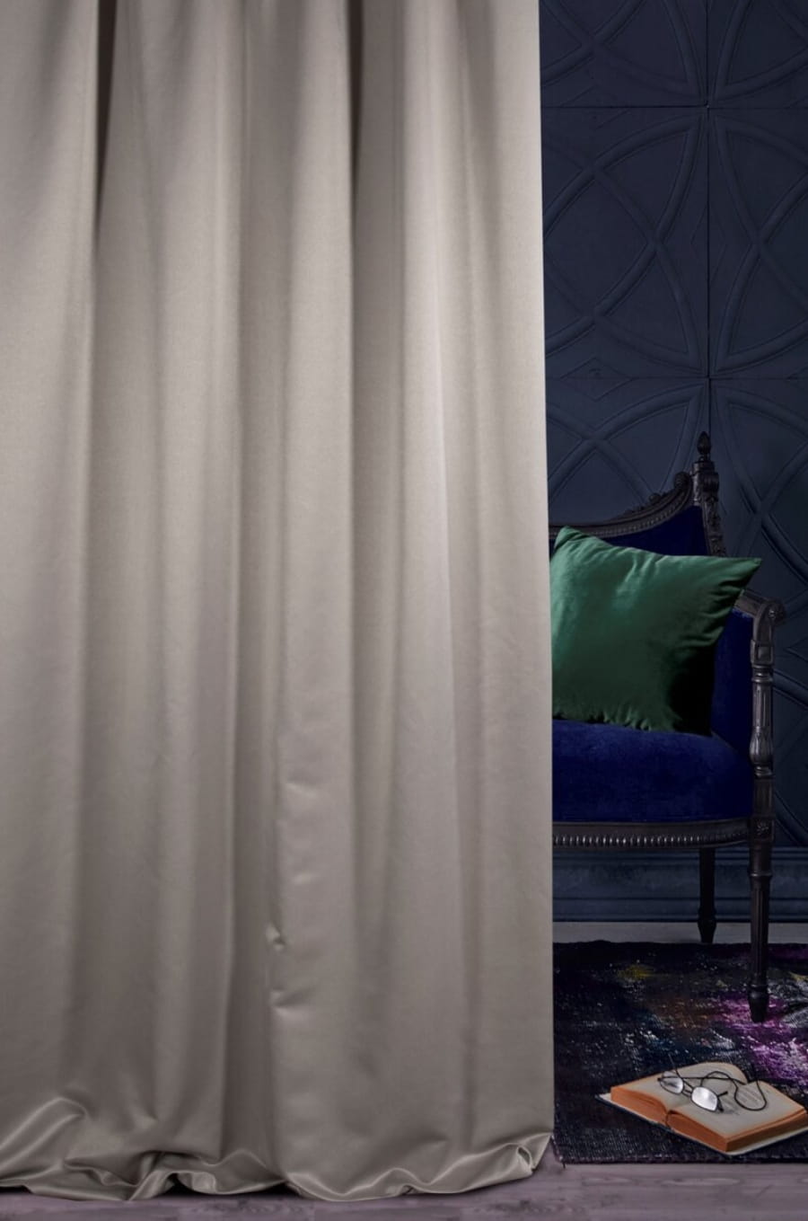 Tkanina dekoracyjna w szarym kolorze. Chroni przed nadmiernym nasłonecznieniem pomieszczenia, co sprzyja relaksowi i zapewnia prywatność. Wszystkie te właściwości sprawiają, że jest to materiał szczególnie praktyczny i często stosowany na zasłony i inne elementy dekoracji wnętrza.