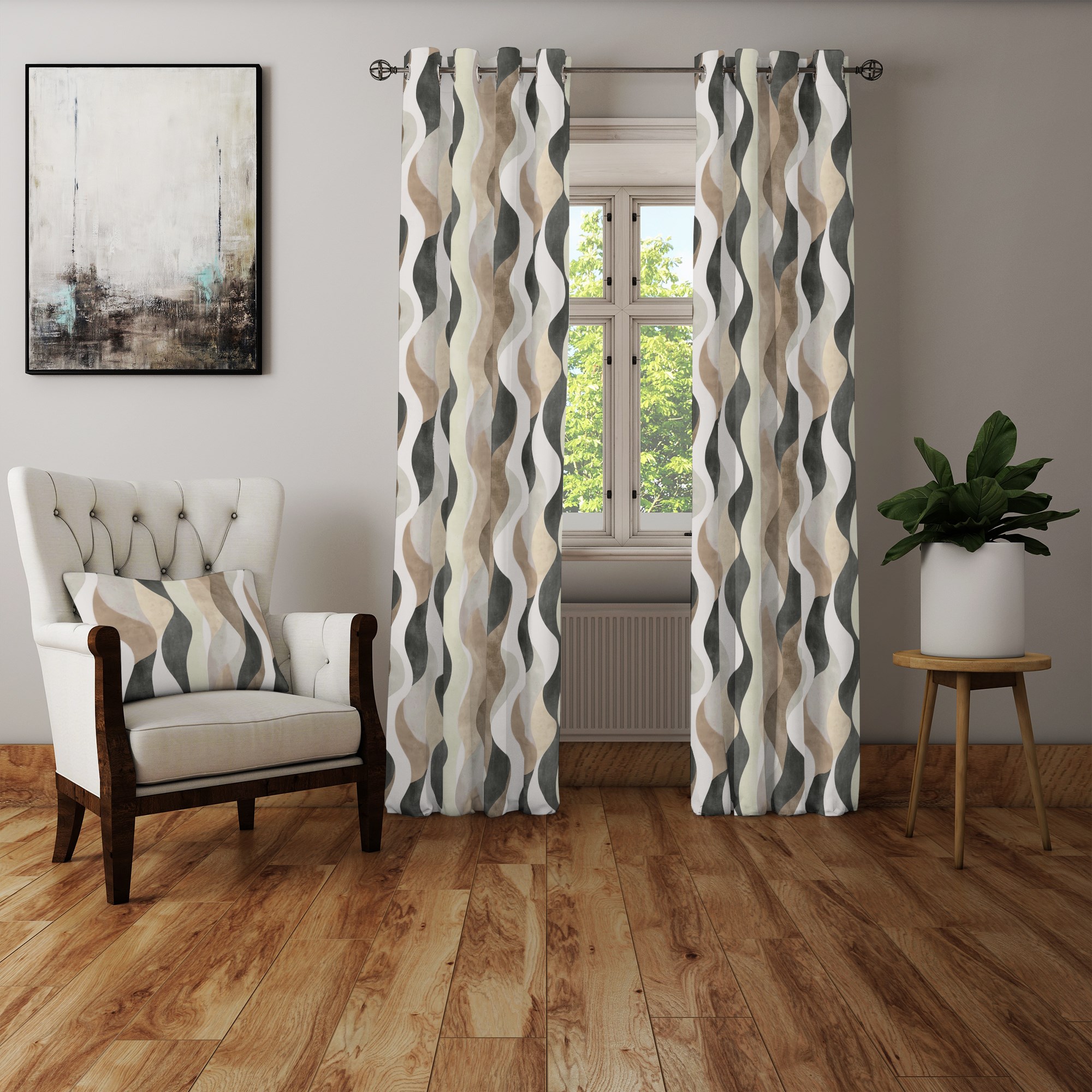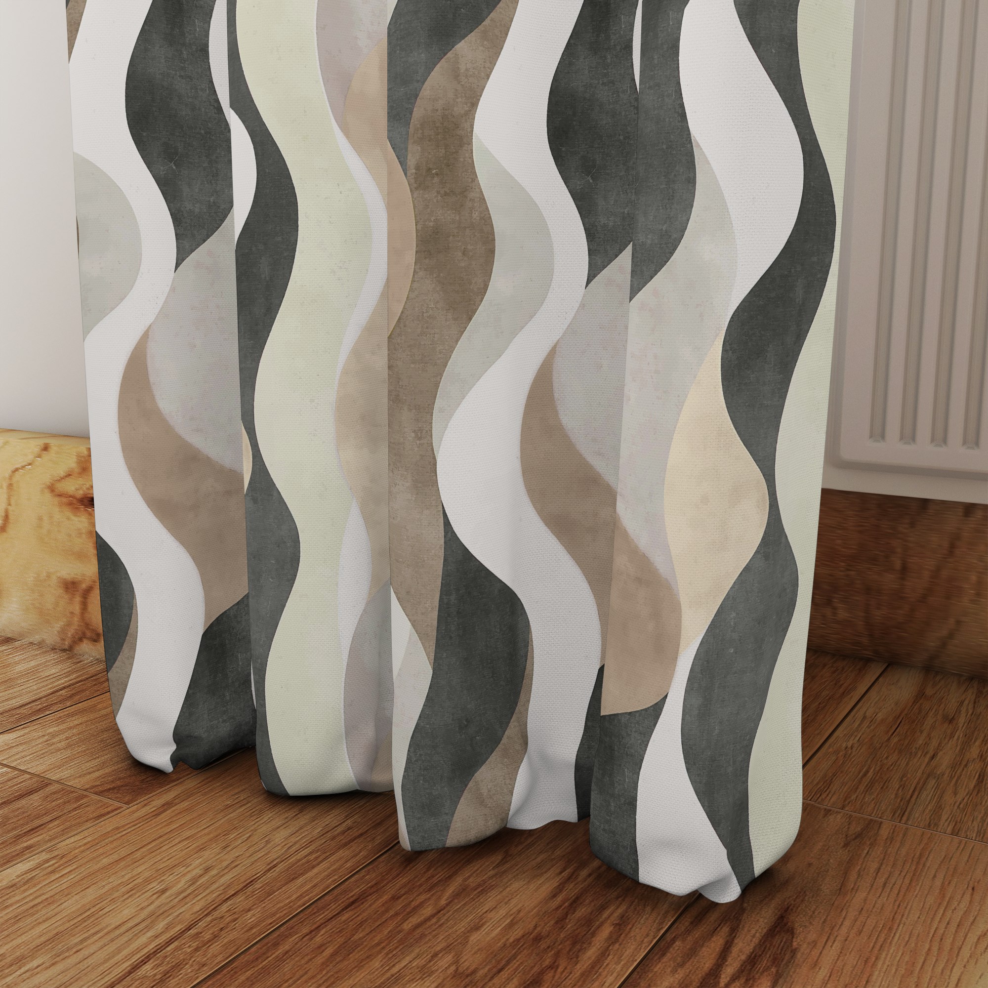Zasłona z miękkiej tkaniny o nowoczesnym, falistym wzorze to wyjątkowa dekoracja, która odmieni każde wnętrze. Materiał charakteryzuje się przyjemną w dotyku strukturą, dobrze się układa. Jest trwały i łatwy w pielęgnacji. Nadruk znajduje się na zewnętrznej stronie, natomiast tylna strona tkaniny jest gładka w jasnym kolorze.