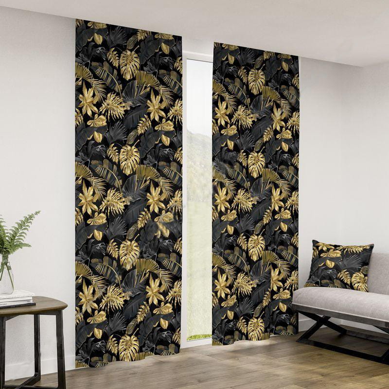 Zasłona gotowa na wymiar przelotki taśma Czarno-Złoty Liść Monster