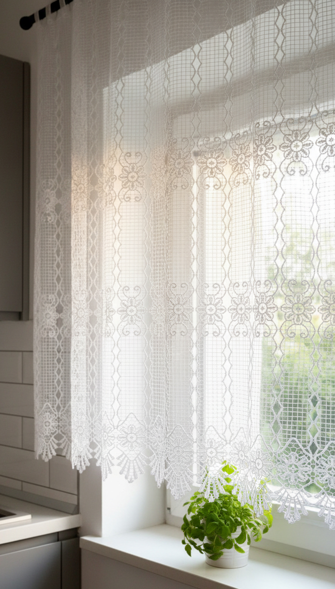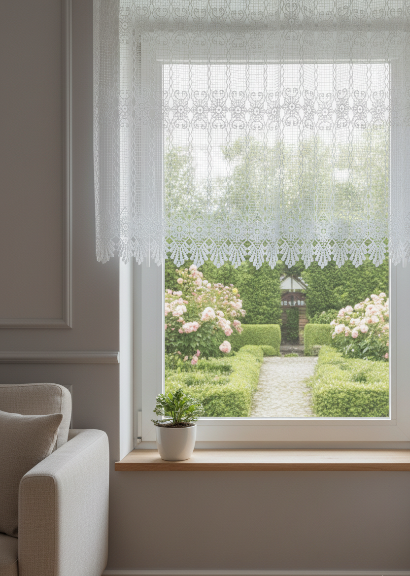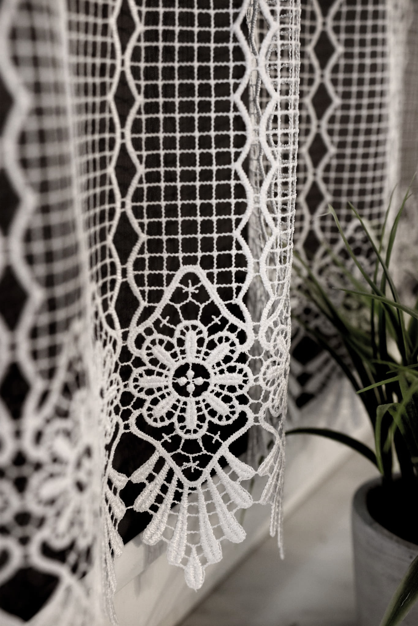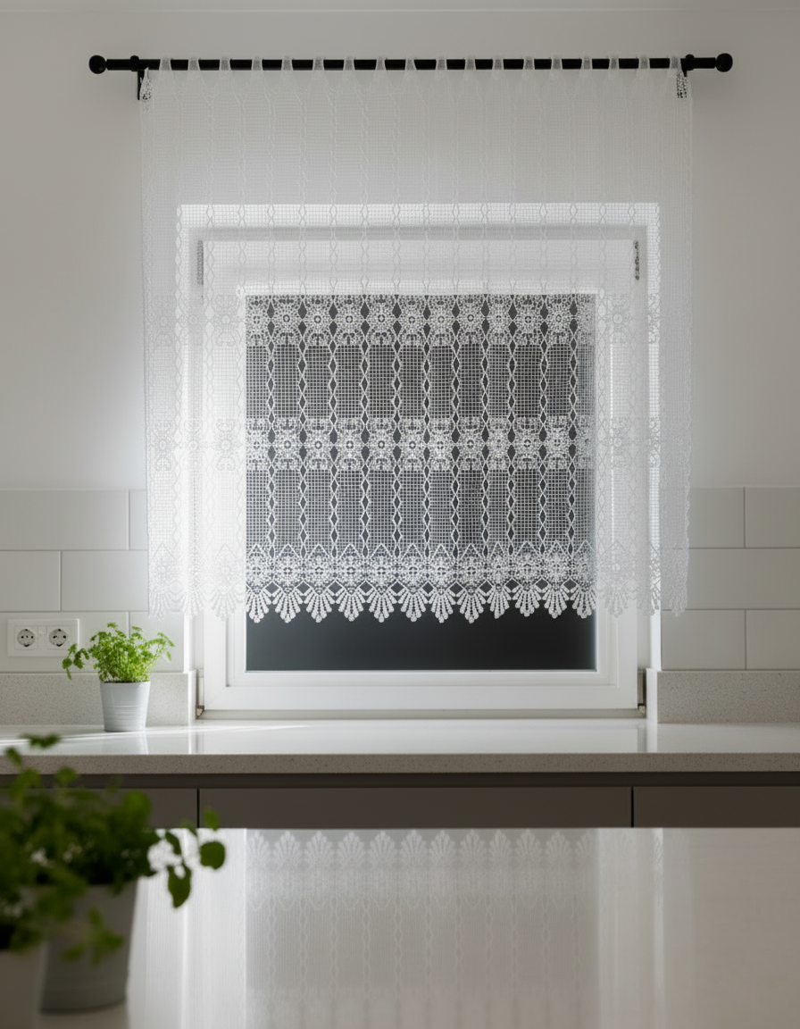 Materiał jest nie tylko trwały, ale także bardzo praktyczny – łatwy w pielęgnacji, nie wymaga prasowania i doskonale się układa. Dzięki swojej strukturze firanka subtelnie zdobi okno, zapewniając jednocześnie delikatną osłonę i swobodny dostęp naturalnego światła.