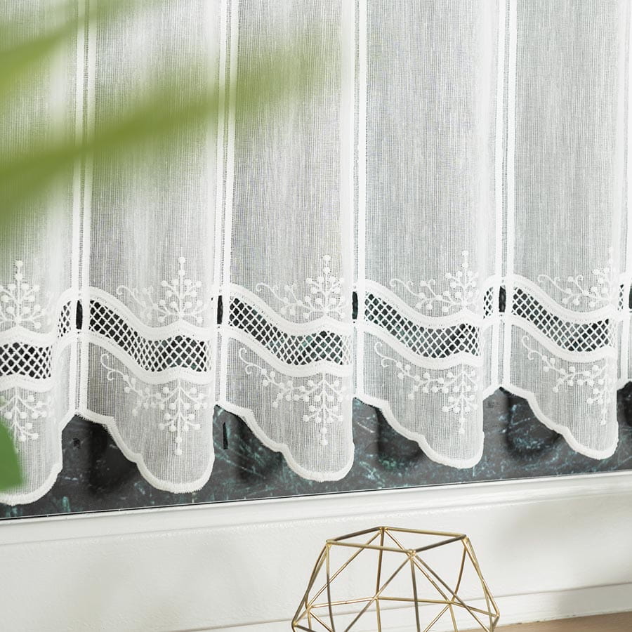 Zazdrostka panelowa w kolorze śmietankowym to doskonały wybór dla osób, które cenią stylowy i elegancki wystrój wnętrz. Delikatna tkanina z subtelnym haftem i ażurową wstawką pięknie rozprasza światło, dzięki czemu kuchnia czy jadalnia stają się przytulne i jasne.