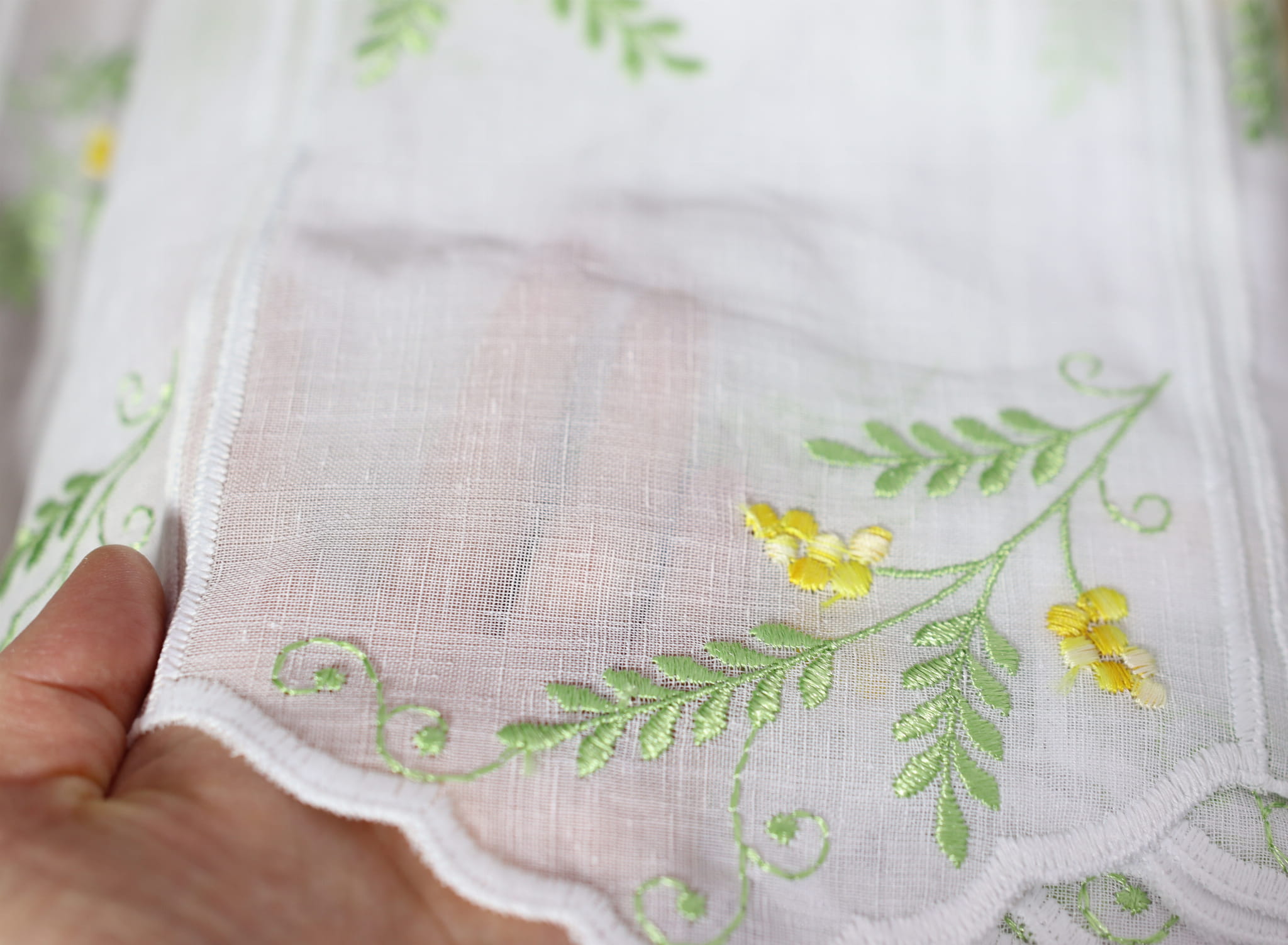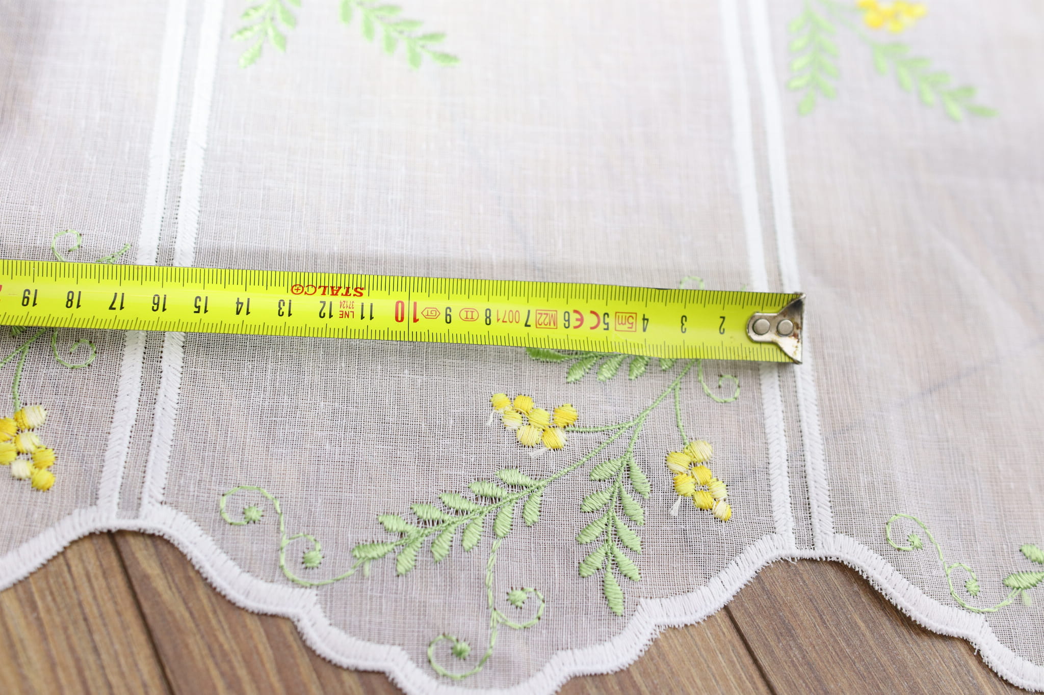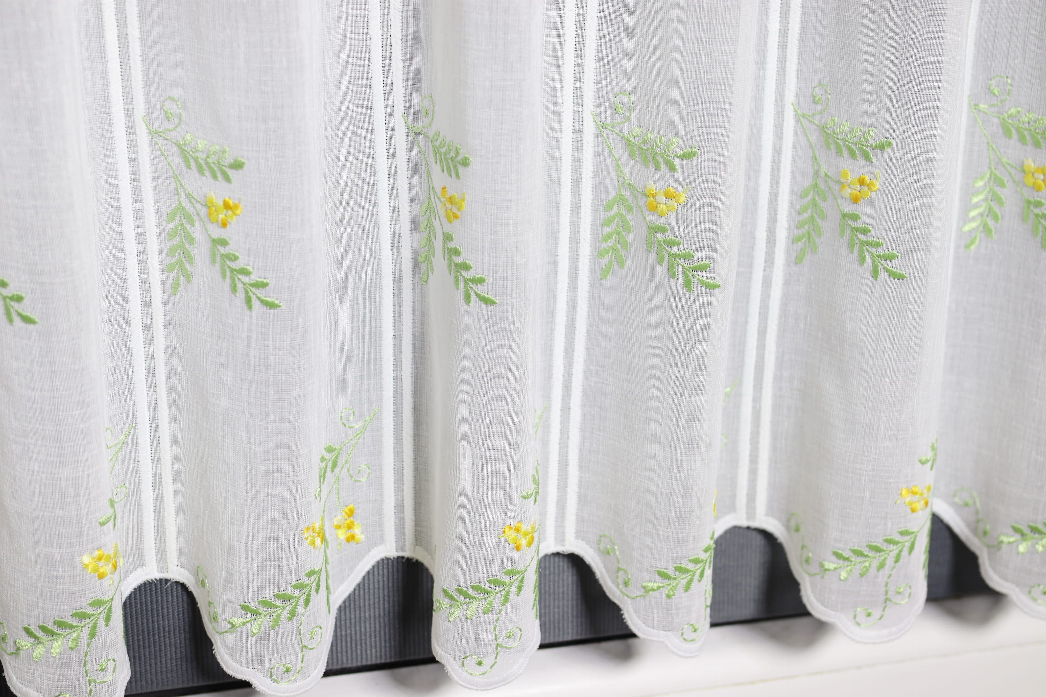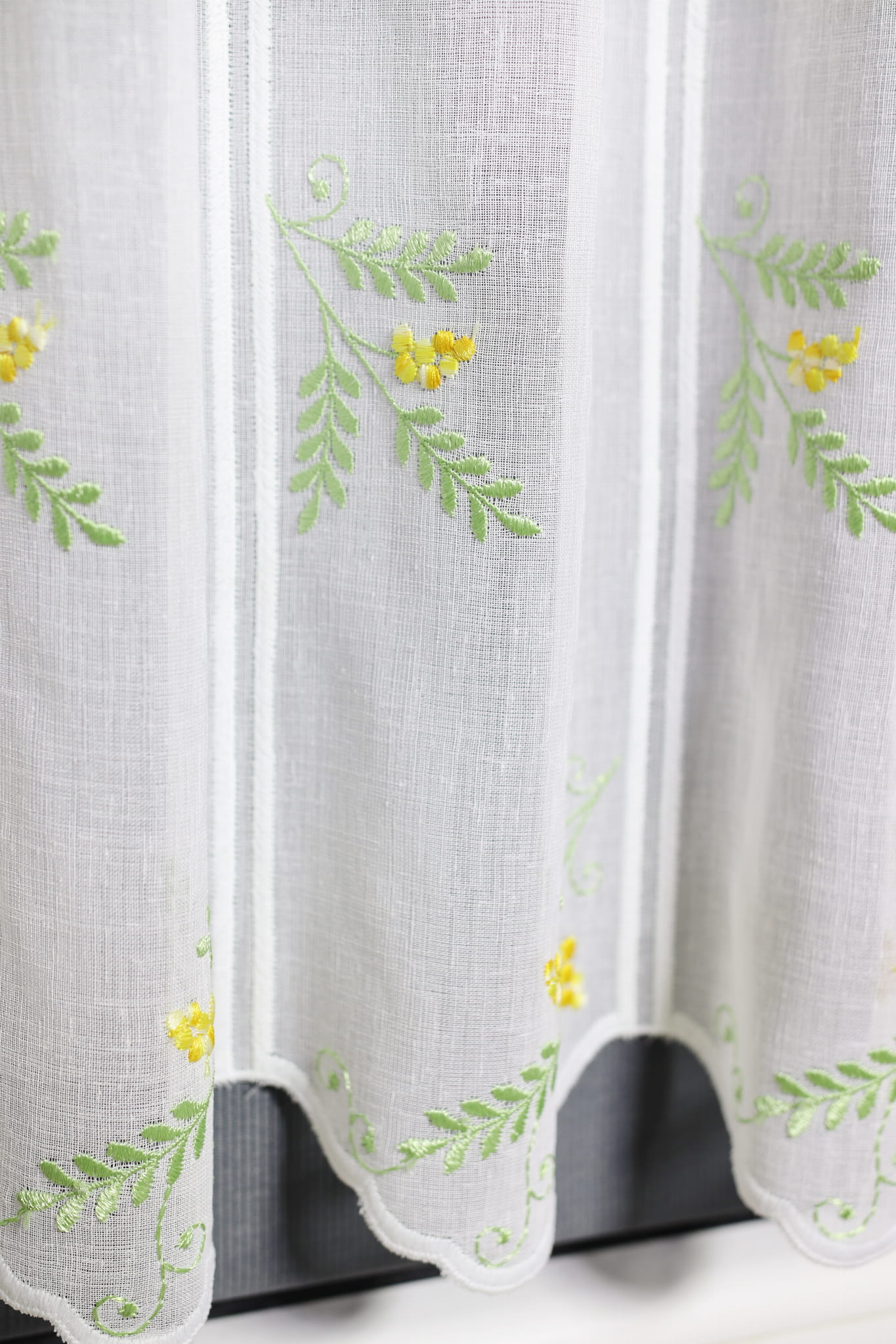 Zazdrostka ozdobiona subtelnym haftem drobnych żółtych kwiatów i zielonych gałązek równomiernie na całej powierzchni wprowadza energię i radosny nastrój do wnętrza.
